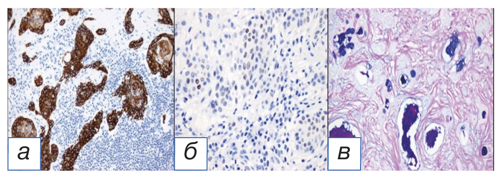 Рис. 2. Опухолевые клетки с цитоплазматическим и мембранозным окрашиванием (а) на цитокератин 5/6 и ядерное окрашивание (б) на иммуногистохимические окрашивания TTF-1. Периодическое специальное окрашивание кислотно-Шифф-альциановым синим выделяет внутрипросветный и интрацитоплазматический муцин (в). ×400.
