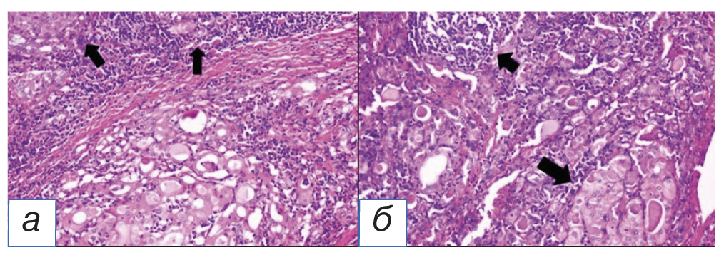 Рис. 3. Граница раздела опухолевых гнёзд (стрелки) с прилегающей тканью щитовидной железы (а). В прилегающей ткани щитовидной железы наблюдаются заметные изменения клеток Гюртле (большая стрелка) и скопления лимфоидных клеток (короткая стрелка) (б). Окраска гематоксилином и эозином, ×200.