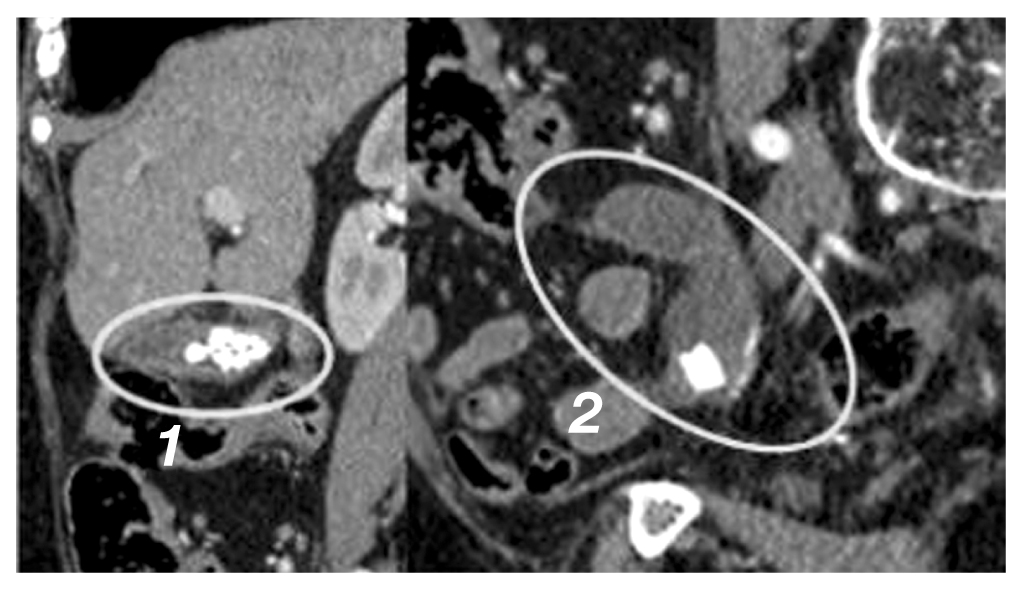 Рис. 1. Компьютерная томография органов брюшной полости с внутривенным контрастированием: 1 — калькулёзный холецистит; 2 — кистозная опухоль аппендикса диаметром около 7 см.