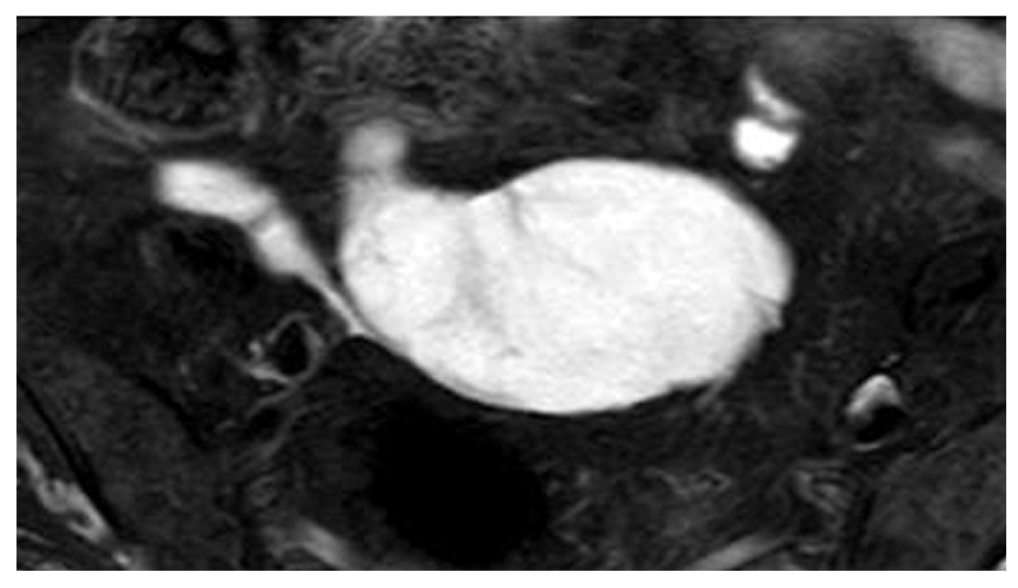 Рис. 2. Магнитно-резонансная томография органов брюшной полости в динамике через 3 года: кистозная опухоль аппендикса диаметром около 10 см.