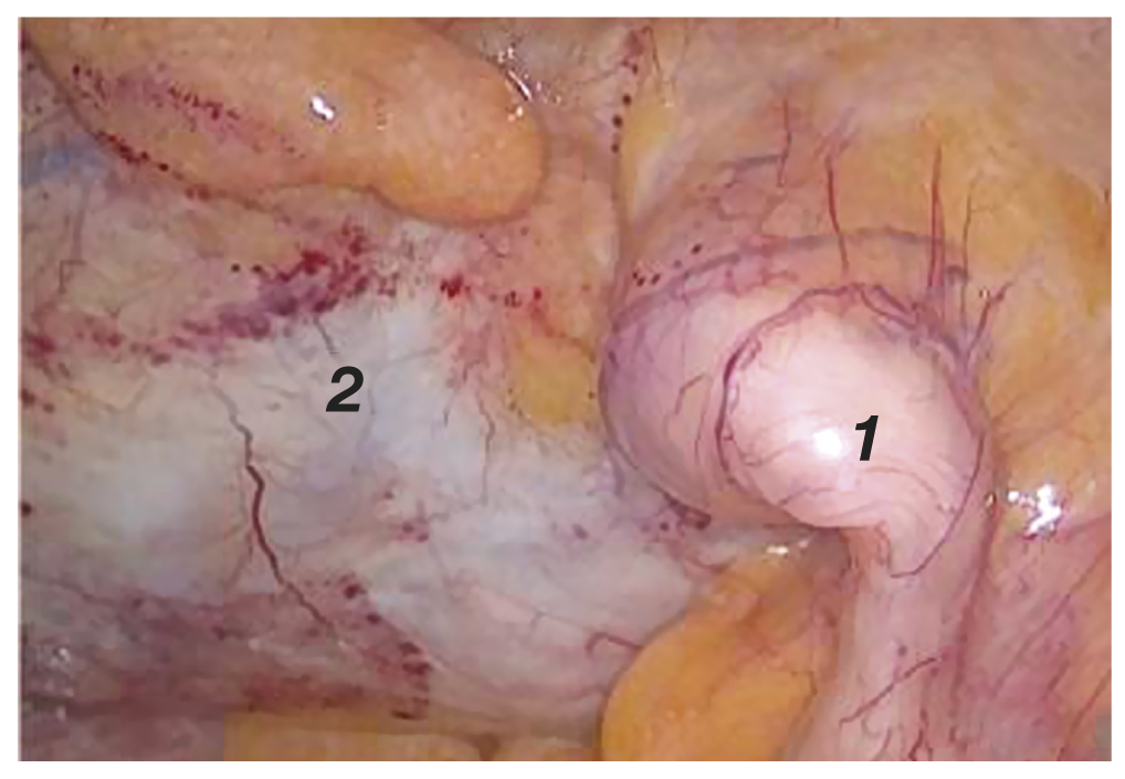 Рис. 3. Интраоперационная фотография: 1 — основание червеобразного отростка; 2 — мукоцеле червеобразного отростка.