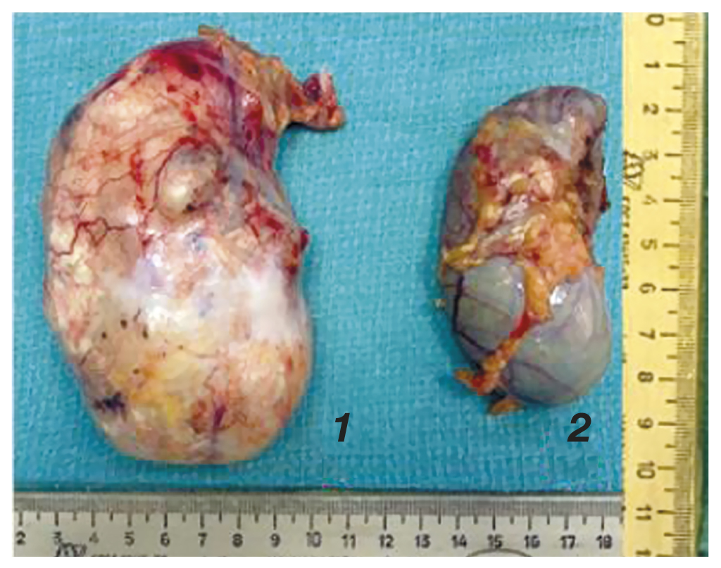 Рис. 4. Удалённый препарат: 1 — червеобразный отросток с кистозной опухолью (мукоцеле); 2 — желчный пузырь.