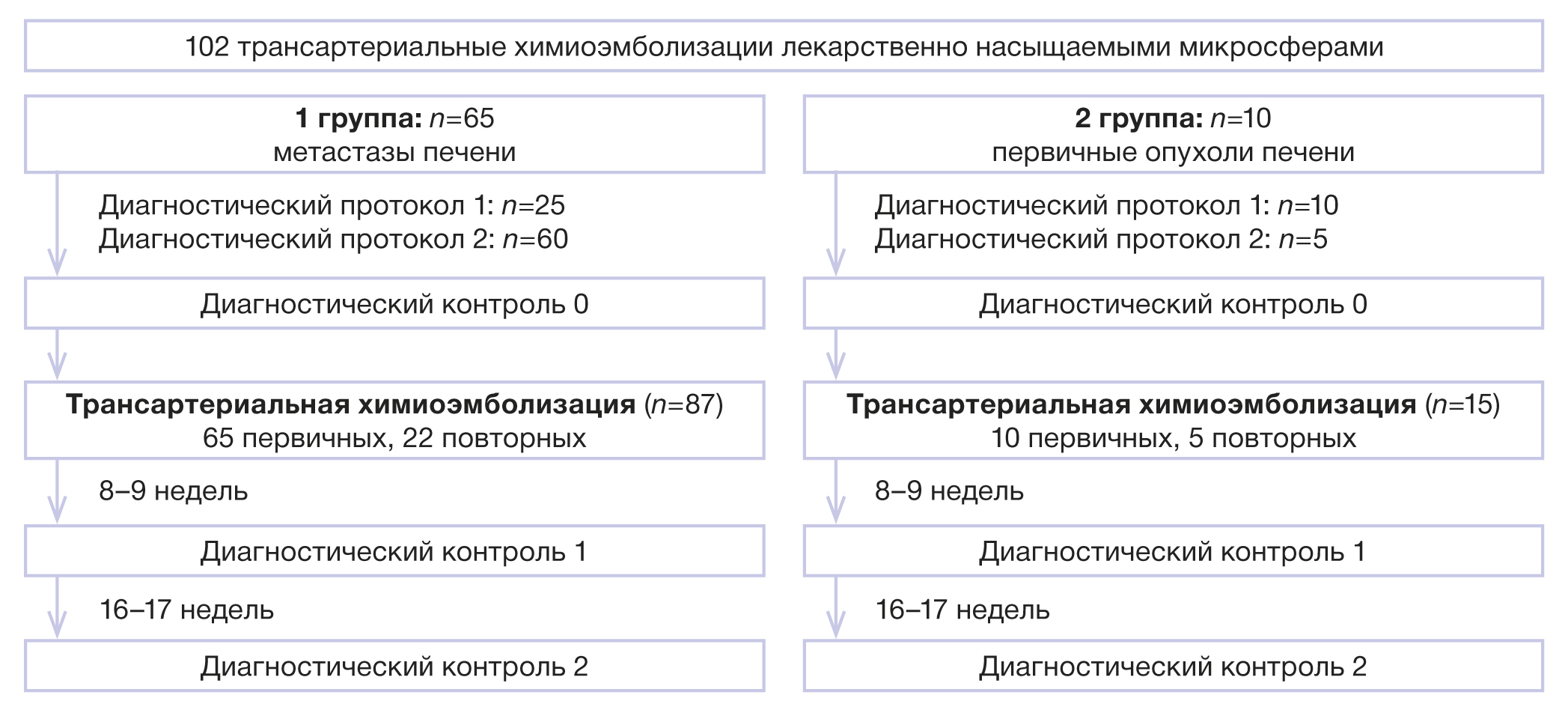 Ретроспективное наблюдательное открытое исследование, включающее 65 пациентов с метастатическим поражением печени (группа 1) и 10 пациентов с первичными злокачественными опухолями печени (группа 2), которым проведено суммарно 102 операции трансартериальной химиоэмболизации лекарственно насыщаемыми микросферами. В группе 1 было выполнено 65 первичных и 22 повторных ТАХЭ, в группе 2 — 10 и 5 соответственно. Для контроля результатов операции были составлены базовые диагностические протоколы, включающие компьютерную томографию (КТ) брюшной полости (протокол 1) и магнитно-резонансную томографию (МРТ) гепатобилиарной зоны (протокол 2) с внутривенным контрастированием, которые следовало выполнить в строго лимитированные сроки: не позднее 2 недель до проведения ТАХЭ, через 8–9 недель и 16–17 недель после вмешательства. Всего в исследование включены 105 КТ брюшной полости с внутривенным контрастированием и 195 МРТ гепатобилиарной зоны с внутривенным контрастированием.