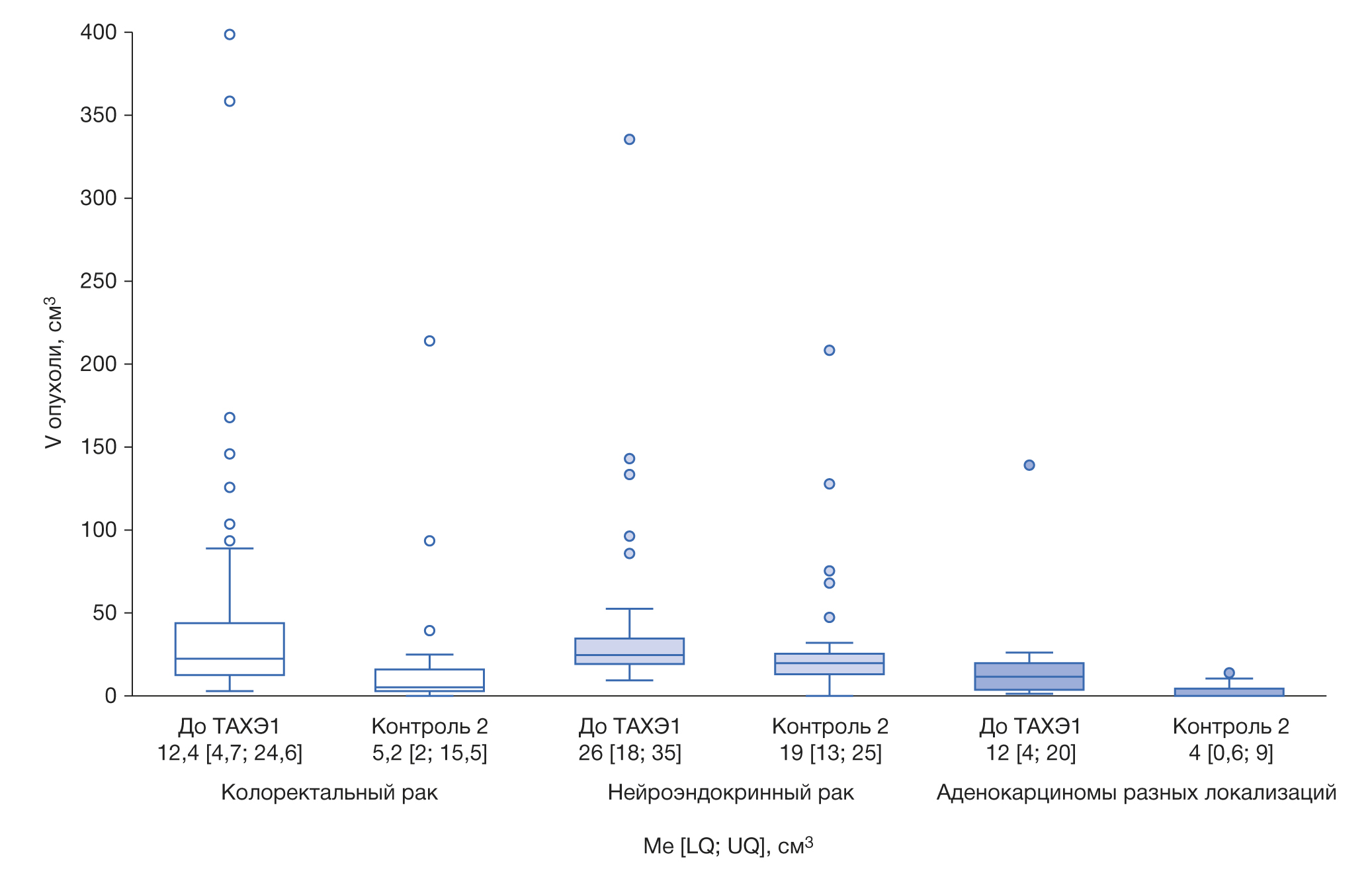 Критерии включения: гистологически верифицированные злокачественные опухоли печени; нерезектабельное поражение печени; выполнение минимального диагностического протокола (КТ или МРТ) не позднее чем за 14 дней до ТАХЭ; соблюдение сроков контрольных исследований: 8–9 недель, 16–17 недель после ТАХЭ.