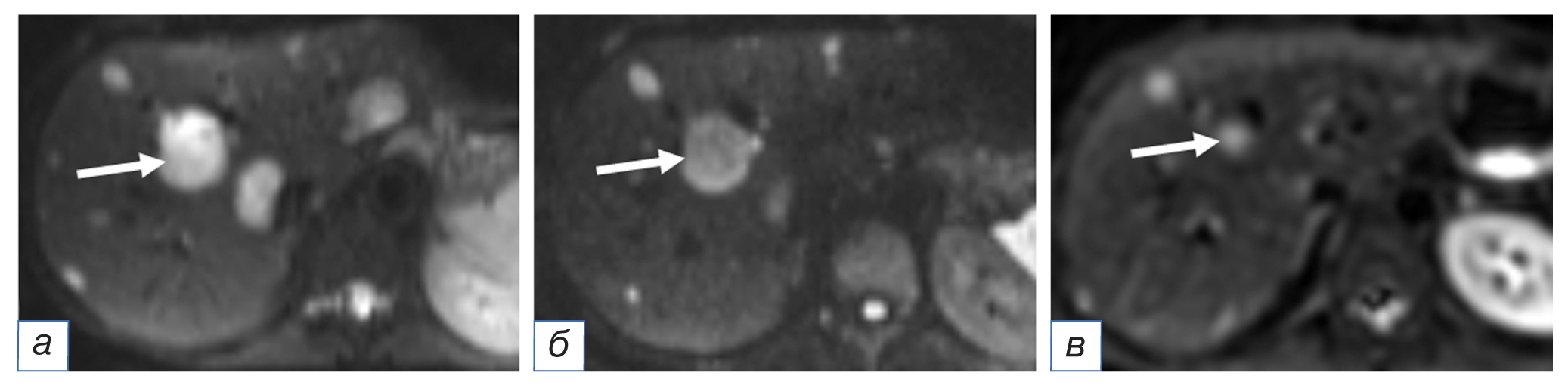 Fig. 3. A 28-year-old female patient with neuroendocrine cancer of the small intestine, the primary focus has not been removed: Magnetic resonance imaging in the DW Iregime before transarterial chemoembolization (а) demonstrates multiple focal lesions of the liver (the control focus is indicated by an arrow); 16 weeks after transarterial chemoembolization (б), the regression of some of the foci, and a decrease in the size of the control lesion (arrow) are noted; 4 years after repeated transarterial chemoembolization (в), the complete regression of lesions had not been achieved, the control lesion decreased by 80% (arrow), there was no progression.
