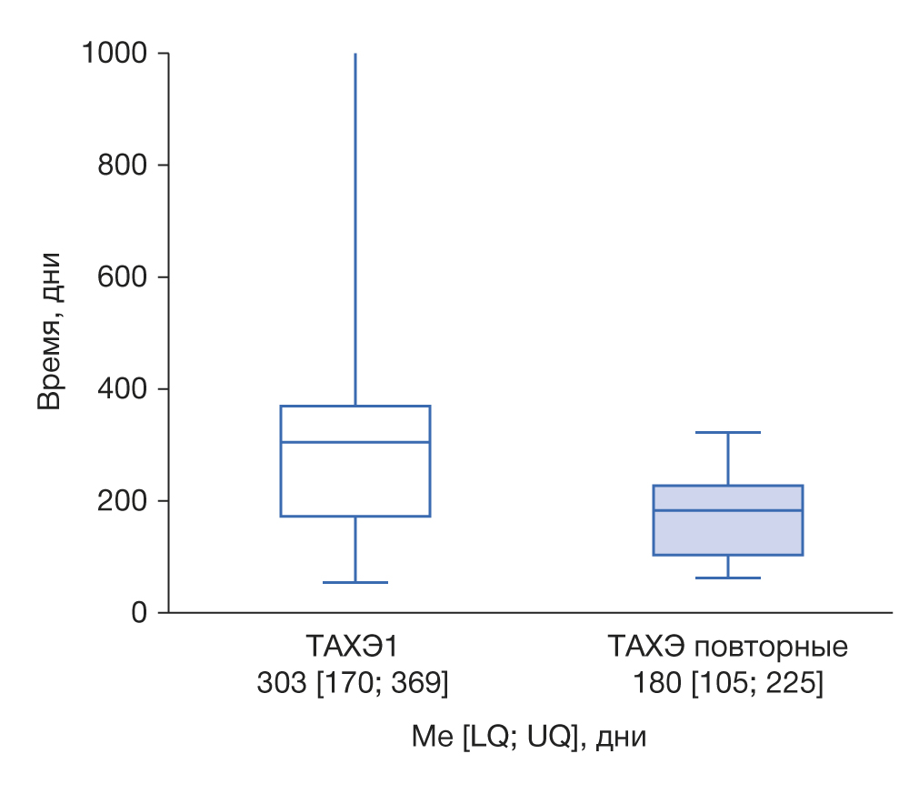Среди ответивших на лечение пациентов группы 1 при прогрессировании процесса было выполнено 15 ТАХЭ2, 5 — ТАХЭ3, 2 — ТАХЭ4. При повторных операциях ТАХЭ отмечалось сокращение времени без прогрессии по печени в 2 раза (с 303 [170; 369] до 180 [105; 225] дней ), что отражено на рис. 4.