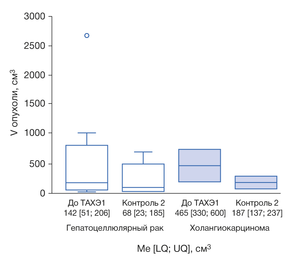В группе 2 прогрессирования процесса не отмечалось ни у одного из пациентов, но и полного регресса тоже не было. Изменение суммарного объёма новообразований при обоих видах первичных опухолей печени после ТАХЭ показано на рис. 5.