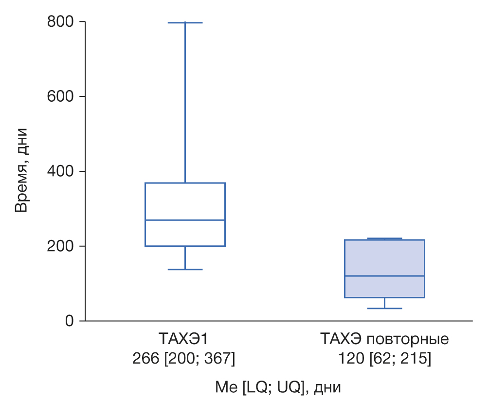 В группе 2 при прогрессировании процесса ТАХЭ2 была выполнена 4 пациентам, ТАХЭ3 — 1. При повторных операциях ТАХЭ, как и в группе 1, отмечалось сокращение времени без прогрессии по печени в 2 раза (с 266 [200; 367] до 120 [62; 215] дней), что отражено на рис. 6.