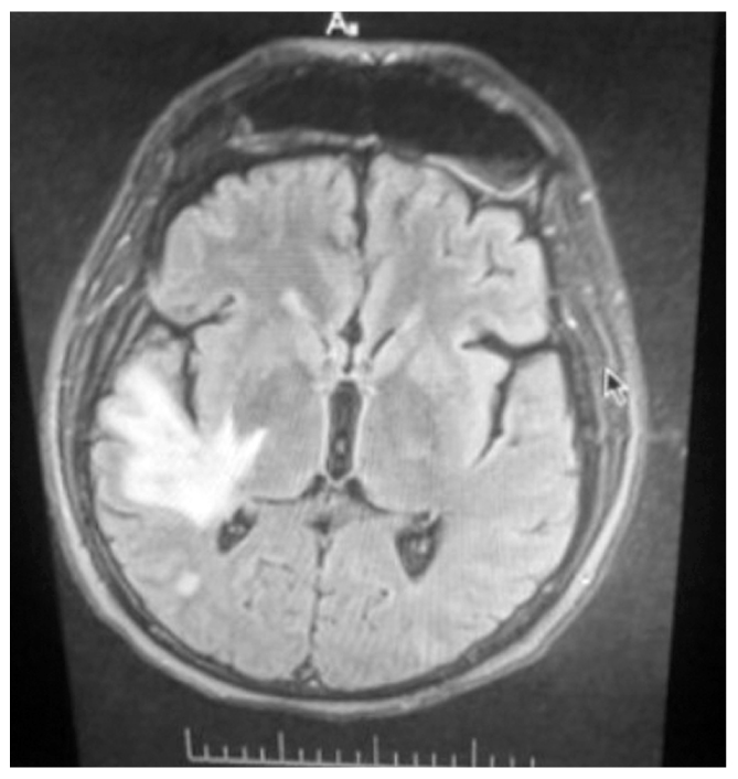 Рис. 1. Магнитно-резонансная томография головного мозга пациента С. с энцефалитическими очагами.