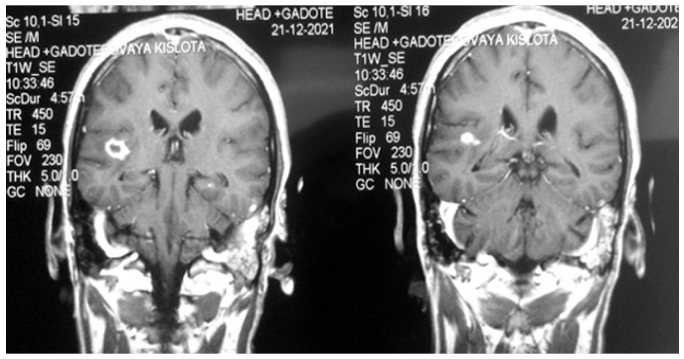 МРТ головного мозга от 21.12.2021 (рис. 2): контрастирование оболочек полушарий мозга (бактериальный менингит), структурные контрастпозитивные изменения в правой височной доле и базальных ядрах, что может соответствовать менингоэнцефалиту с косвенными признаками формирующегося абсцесса.