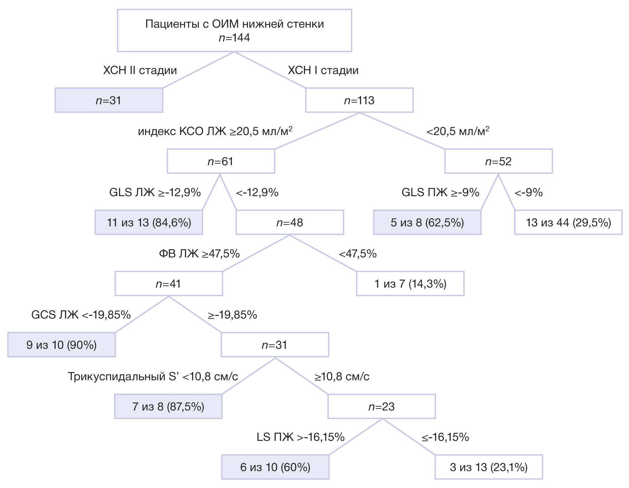 Рис. 1. Дерево принятия решений о повторной реваскуляризации у пациентов с острым инфарктом миокарда нижней стенки левого желудочка после первичного чрескожного коронарного вмешательства по данным эхокардиографии. ОИМ — острый инфаркт миокарда; ХСН — хроническая сердечная недостаточность; ЛЖ/ПЖ — левый/правый желудочек; КСО — конечный систолический объём; GLS — продольная деформация; ФВ — фракция выброса; LS — продольная деформация.