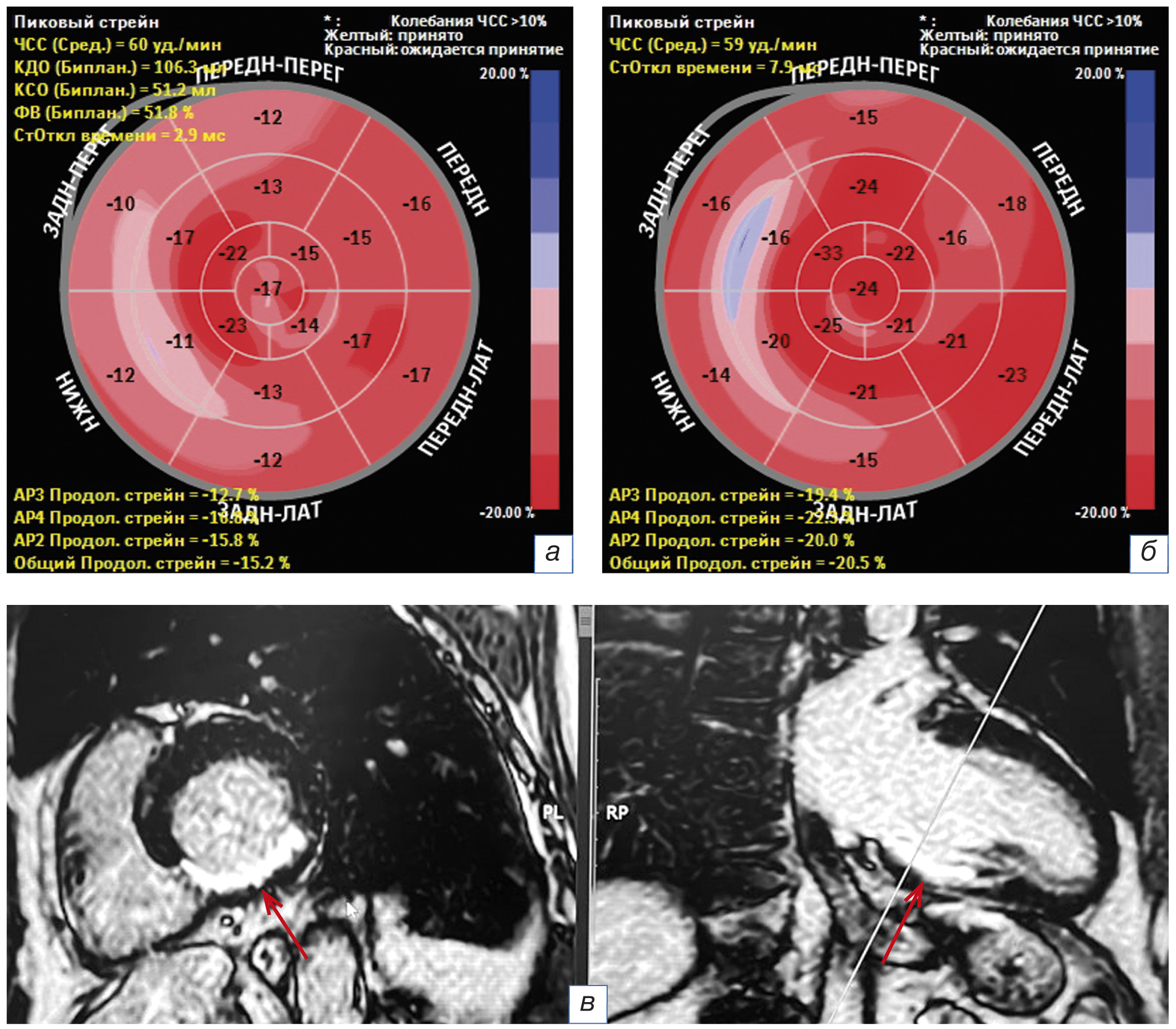 Fig. 2. A patient with fibrotic changes in the lower wall of the left ventricle after acute myocardial infarction: а — «bull’s eye» with segmental longitudinal deformation of the left ventricle on the 5th day of acute myocardial infarction of the lower wall of the left ventricle, б — «bull’s eye» with segmental longitudinal deformation of the left ventricle after 17 months, в — magnetic resonance tomogram image in short (on the left) and long (on the right) axis 17 months after acute myocardial infarction (arrows). ЧСС — heart rate; КДО/КСО — end-diastolic/systolic volume; ФВ — ejection fraction.