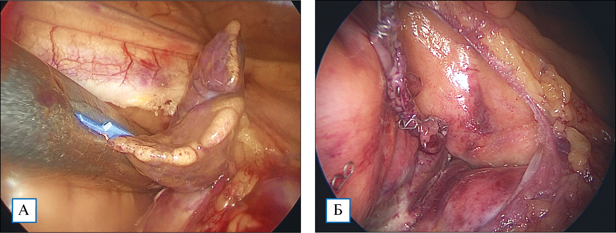 Рис. 1. Интраоперационная фотография: захват основания ушка левого предсердия сшивающим аппаратом (А); культя ушка левого предсердия (Б)