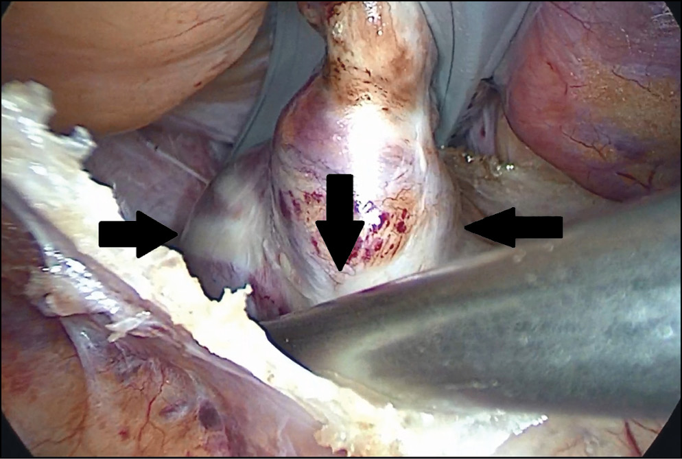 Рис. 2. Интраоперационная фотография: абляционные линии на задней стенке левого предсердия и вокруг коллектора левых легочных вен (указаны черными стрелками)