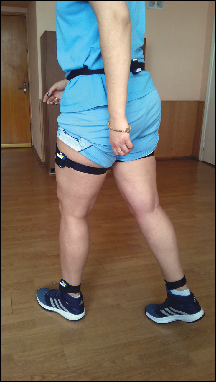 Исследование биомеханики походки проводилось по методике, опубликованной нами ранее [13]. Кинематику движений в тазобедренных и коленных суставах пациента исследовали с помощью пяти инерционных сенсоров, которые располагали на нижних конечностях (верхняя треть бедра и нижняя треть голени с наружной стороны, где имеется наибольшее соприкосновение с костными выступами) и в области таза; центральный сенсор фиксировали в области крестца. Фиксация осуществлялась эластичными лентами на кожные покровы пациента (рис. 1).