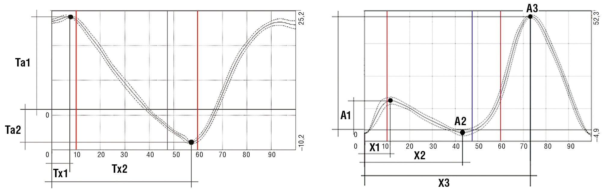 • для тазобедренного сустава: по движению сгибание-разгибание отмечали амплитуду максимального сгибания в начале периода опоры (Ta1, в градусах) и фазу данной амплитуды (Tx1, в % от ЦШ), амплитуду максимального разгибания (Ta2, в градусах) и ее фазу (Tx2, в % от ЦШ) (рис. 2);