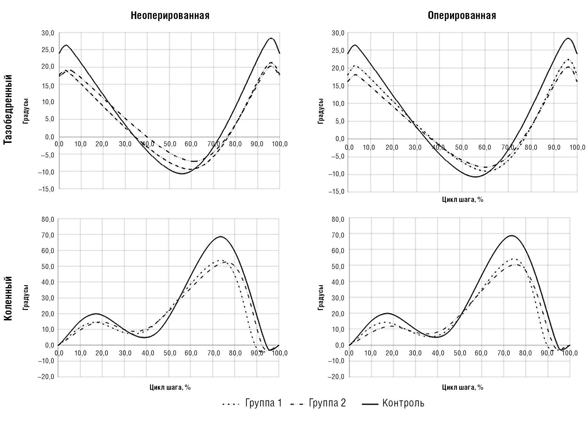 Наиболее демонстративны изменения функции коленного сустава, которые показывают снижение амплитуды первого и второго сгибания прооперированной и интактной конечности в обеих группах, при этом в большинстве исследований главным показателем является снижение амплитуды сгибания прооперированной конечности [16, 17]. В нашем исследовании изменения на обеих конечностях приводят к отсутствию выраженной функциональной асимметрии. В доступной же литературе показано наличие асимметричной походки, которая перегружает контралатеральные суставы [8, 9].