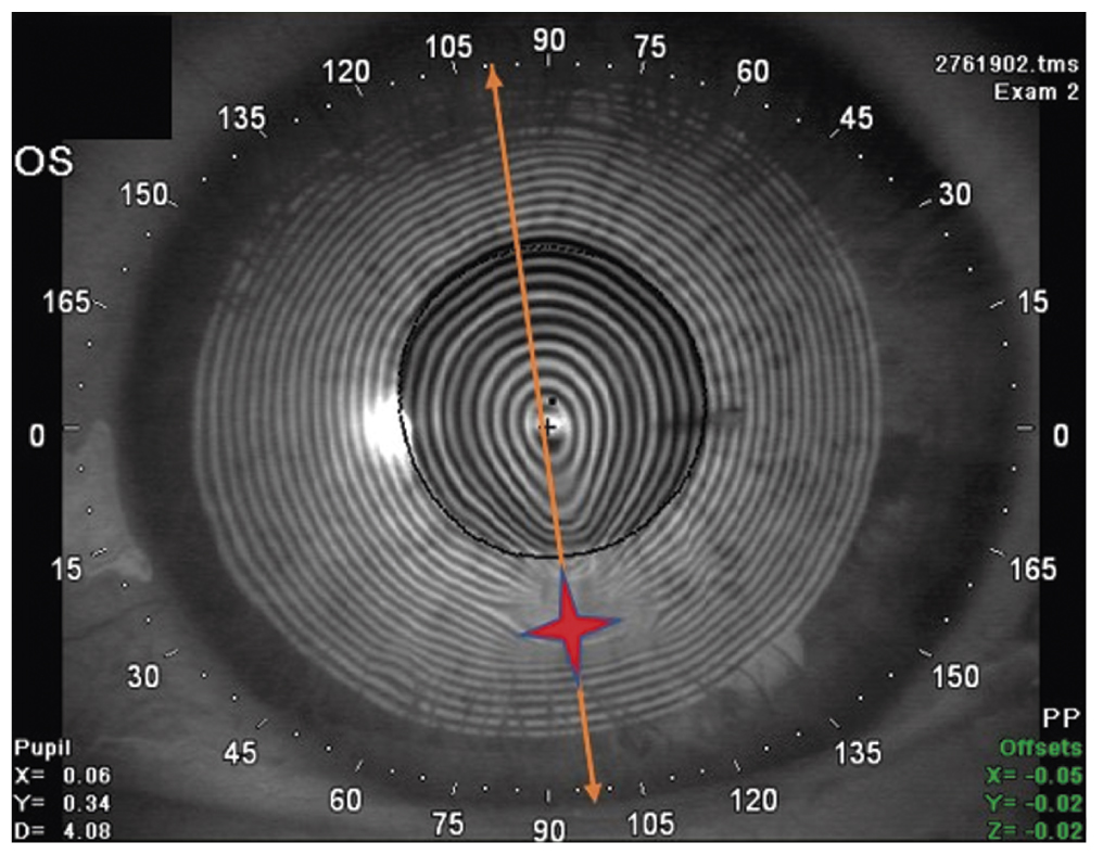 Рис. 2. Кератоскопическая карта левого глаза пациента М.: зона максимальной кератэктазии (разошедшийся кератотомический рубец) отмечена красной звёздочкой, ось самого плоского меридиана — жёлтой стрелкой