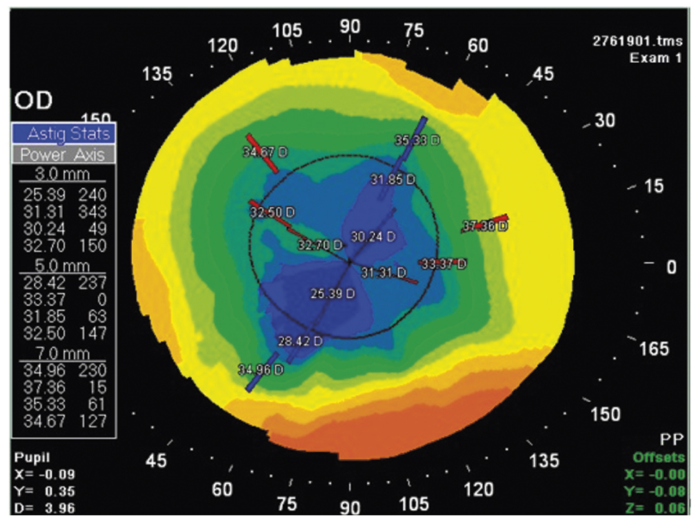 Fig. 3. Keratotopographic map of the right eye of patient M