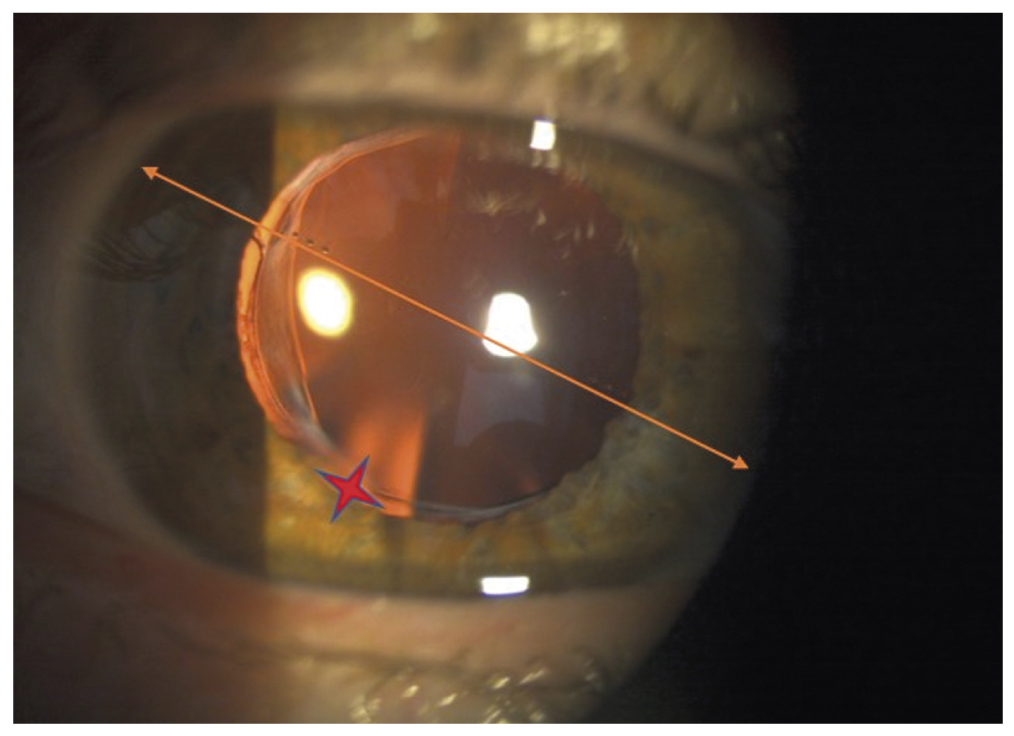 Рис. 6. Левый глаз пациента М. через 1 месяц после имплантации торической интраокулярной линзы: красной звёздочкой обозначен разошедшийся тангенциальный рубец, жёлтой стрелкой — положение оси цилиндра торической интраокулярной линзы