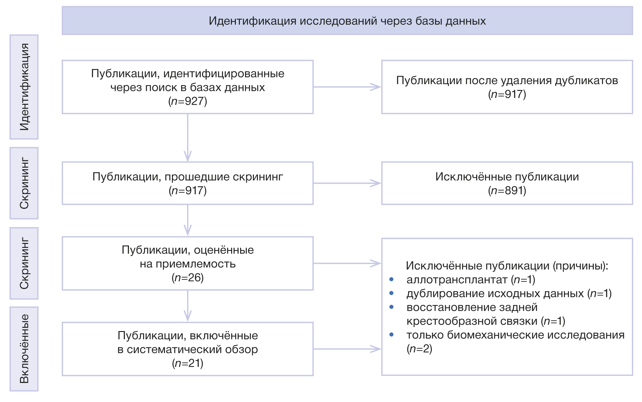 Initially, as a result of literature search, a total of 927 articles were found (Fig. 1) [23]. After excluding the duplicate publications, 917 articles were remaining, while after screening the titles and abstracts — 26articles were obtained, the full texts of which were verified for conformity to the inclusion criteria. All the selection criteria after the double-staged screening were met by 21 articles [24–43]: 16 articles, which were reporting about the results of reconstructing the anterior cruciate ligament using the LPMT autotransplant, and 5articles, in which comparison was made for the results of using LPMT and SGMT autografts. All the articles (n=21) were compiled into a summary table (table 1). The total set of analyzed results included 2322 patients, of which 1660 had a reconstruction of the anterior cruciate ligament using the LPMT autotransplant, while the results for remaining 662 patients were extracted from the publications, in which comparison was made for the use of LPMT and SGMT autografts.