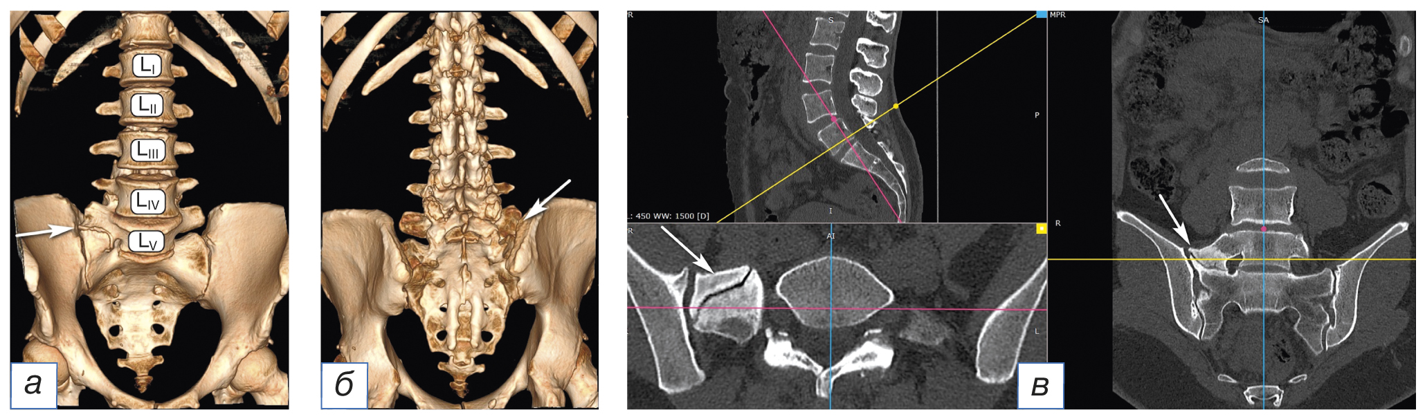 Fig. 1. Sacralization from a multispiral computer tomography scan: MSCT 3D front projection (а); MSCT 3D rear projection (б); MSCT reconstruction with a poly-projection scan (в). At the LV vertebra level, a lumbosacral junction anomaly is determined by the type of asymmetric right-sided sacralization of the LV vertebra with the formation of neoarthrosis between the massive transverse process and the lateral mass of the sacrum (white arrow). The body of the LIV vertebra is displaced ventrally by 0.45 cm (grade I antespondylolisthesis). Spondyloarthrosis LIV–LV III degree according to D. Weishaupt [14]. Sacralization of LV vertebra type IIa according to A.E. Castellvi [15]