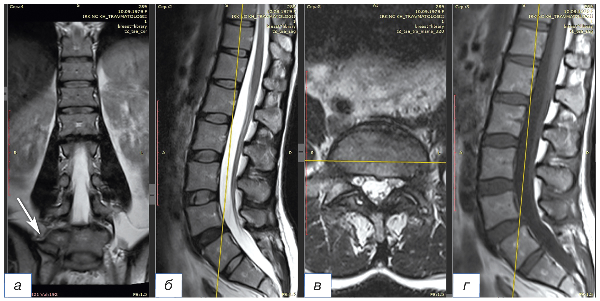 Fig. 2. Magnetic resonance imaging Т2-weighted image, frontal projection (а), sagittal projection (б), and axial projection (в); Т1-weighted image, sagittal projection (г). Neoarthrosis between the transverse process and lateral mass of the sacrum (white arrow). Compression of the spinal roots is not determined