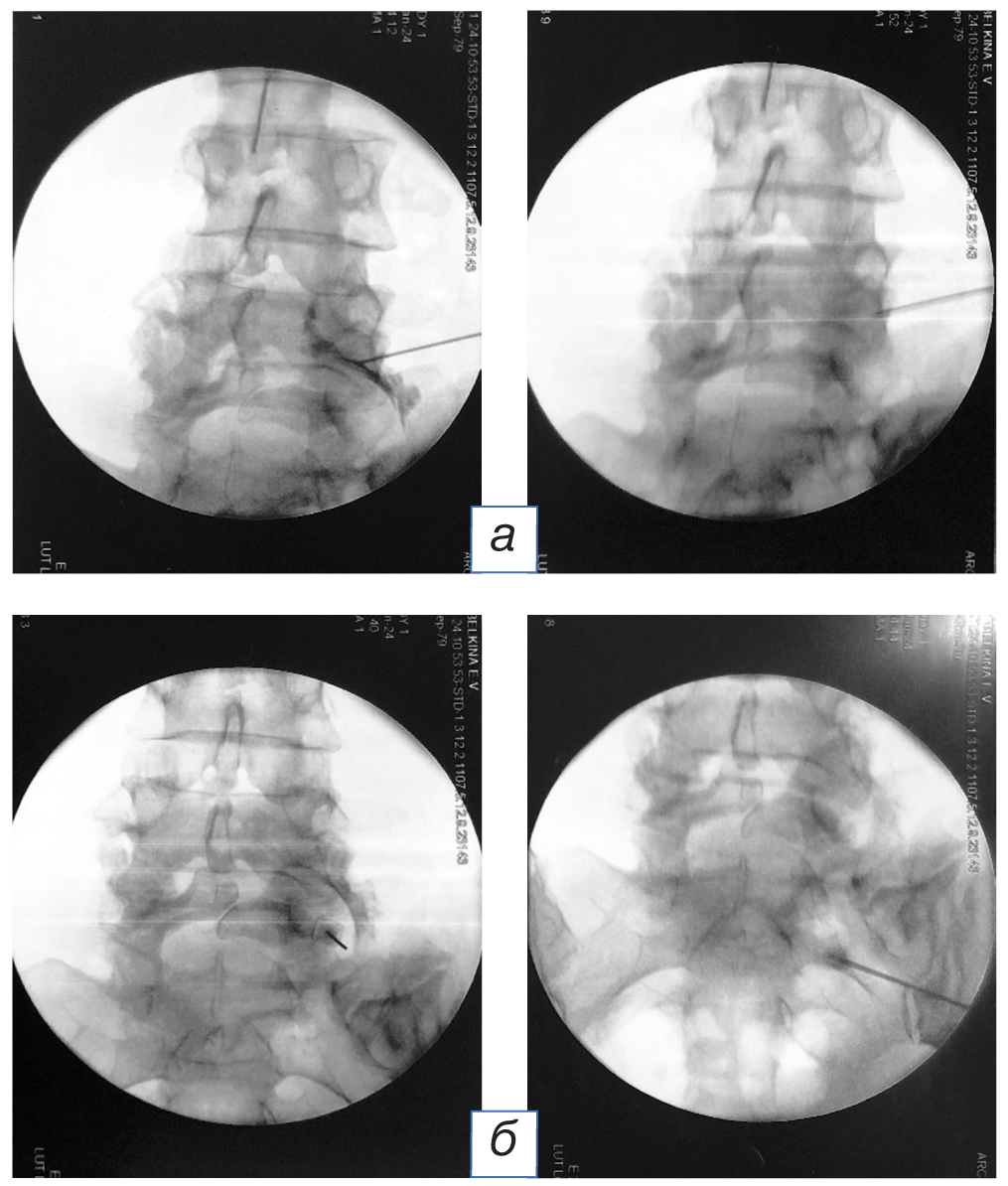 Fig. 3. Intraoperative radiographs: the electrode is installed at the level of the dorsal ganglion and radicular nerve in the projection of the LIV–LV foramen on the right, to verify the root, contrast with iohexol 300 was performed to perform pulsed radiofrequency ablation (а); the electrode is installed in the projection of the facet joint LIV–LV and LV–SI on the right in the projection of the Luschka nerve innervating the facet joint for thermal radiofrequency ablation (б) [16]