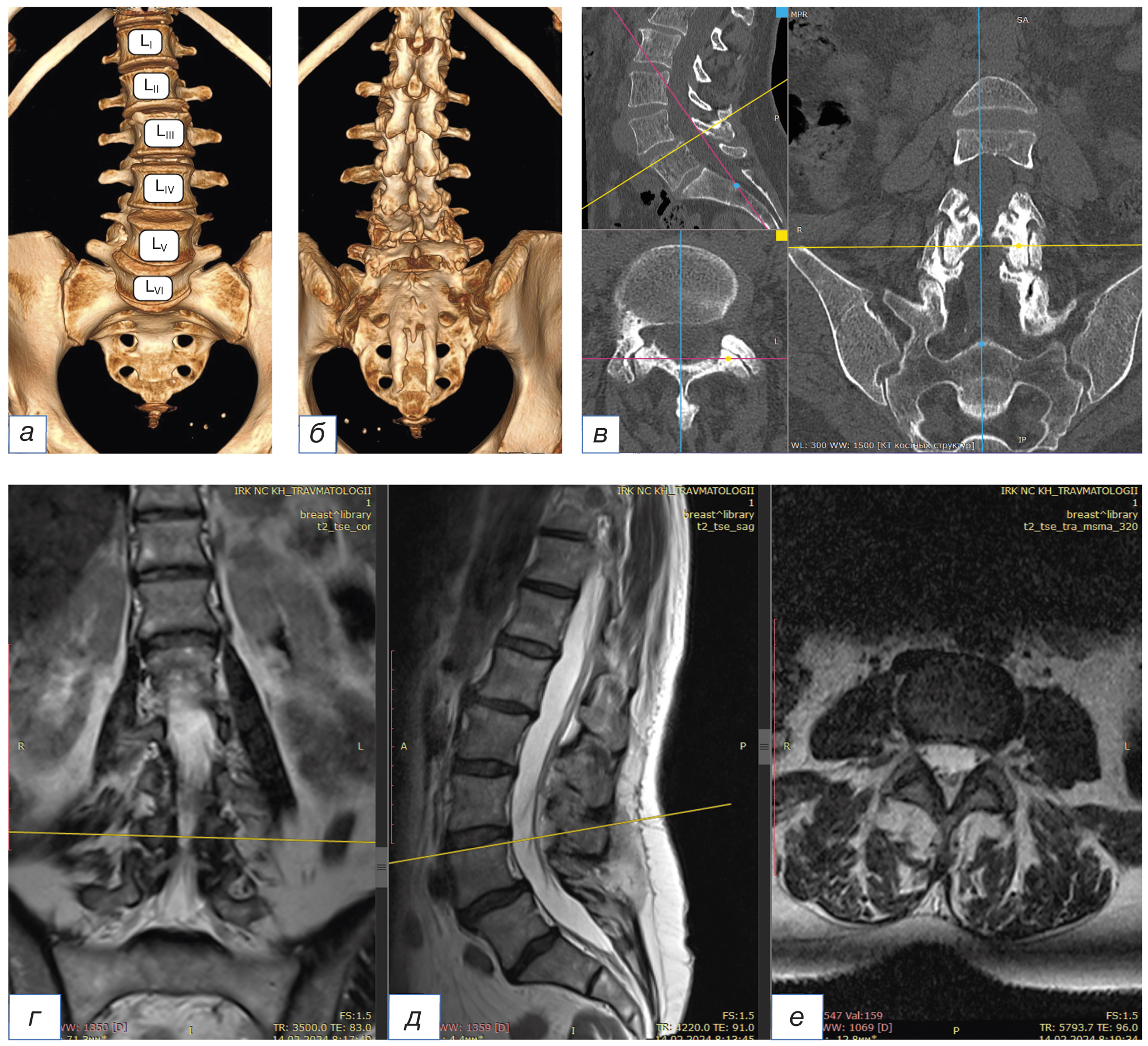 Fig. 4. Lumbarization from a multispiral computer tomography scan: MSCT 3D front projection (а), MSCT 3D rear projection (б), and MSCT reconstruction with a projection scan at the LV–LVI level (в). Six lumbar vertebrae are shown. Left-sided scoliosis with curvature of the spine up to 170° with the apex of the arch on LIV. Hyperlordosis. The body of the LV vertebra is displaced ventrally by 0.46 cm (grade 1 antespondylolisthesis). Spondyloarthrosis LIV–LV, LV–LVI III degree according to D. Weishaupt [14]. Lumbarization from a magnetic resonance imaging, T2-weighted image: frontal projection (г), sagittal projection (д), and axial projection (е) with hyperintensive signal in arched joints LIV–LV, LV–LVI III degree according to A. Fujiwara [14]