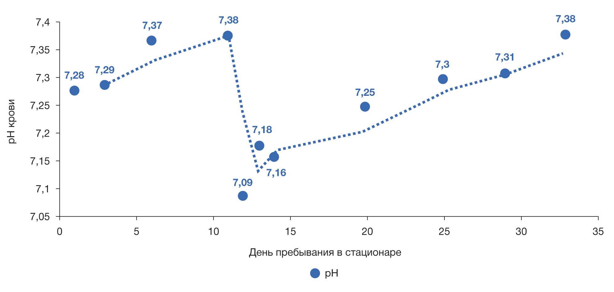Рис. 1. Показатель кислотно-щелочного состояния в период пребывания в стационаре. Норма кислотно-щелочного состояния 7,35–7,45