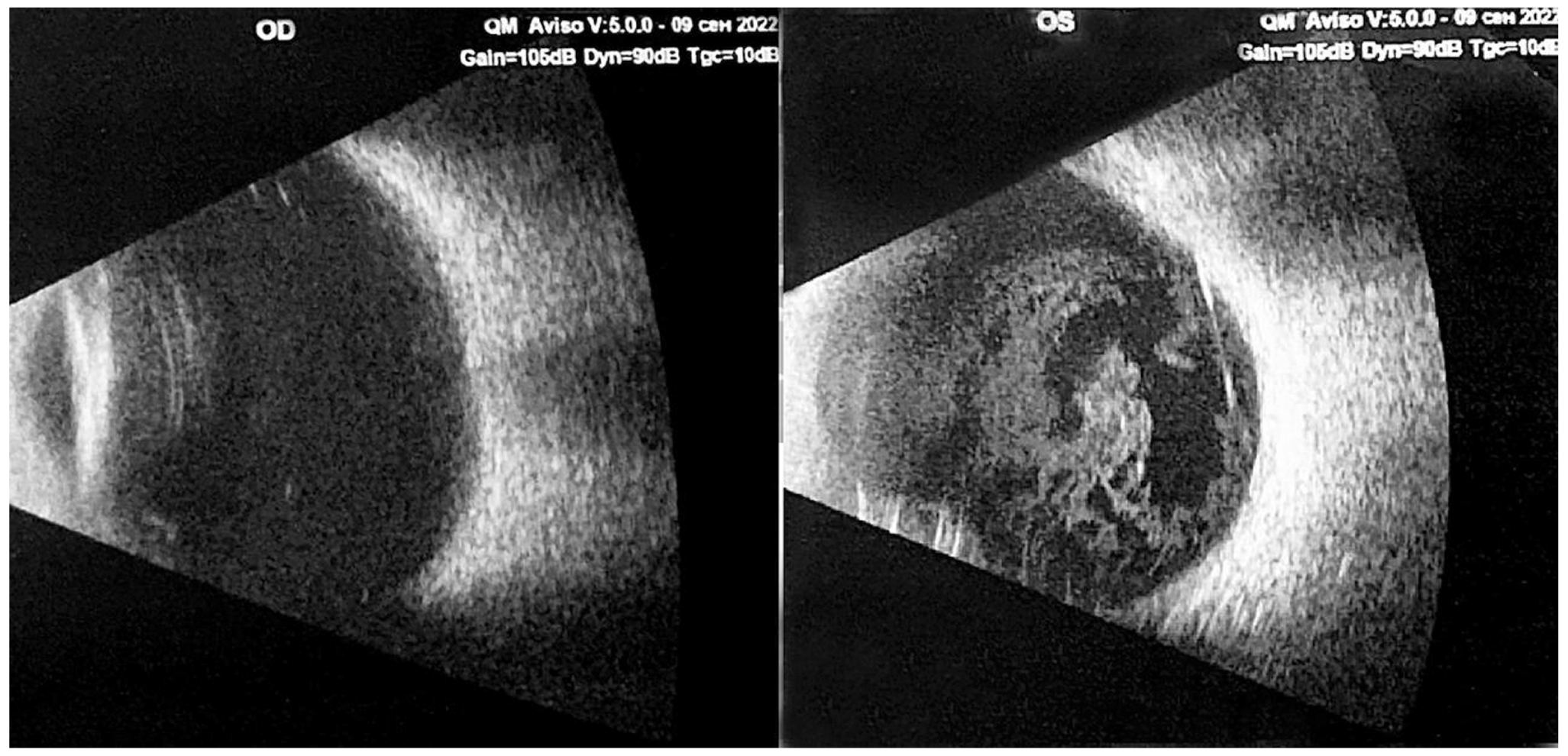 Рис. 2. В-сканирование обоих глаз до операции