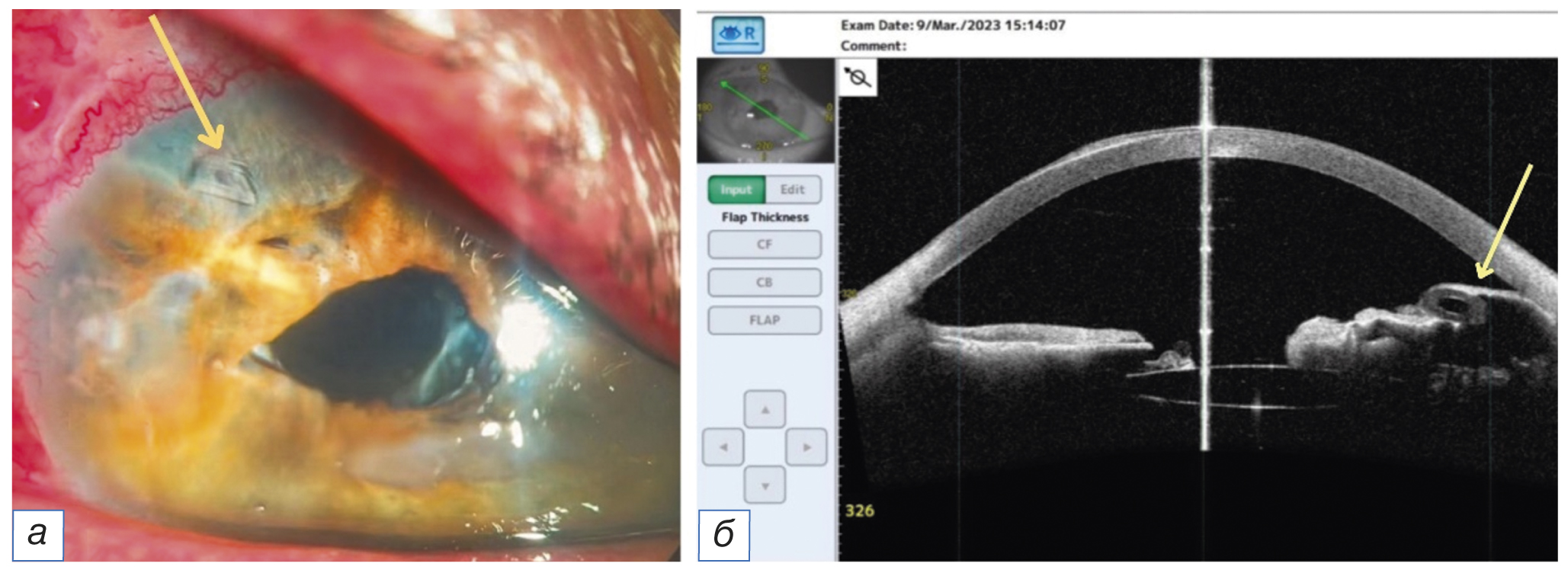 Рис. 4. а — биомикроскопия правого глаза после имплантации клапана Ахмеда (стрелкой указана трубка клапана); б — оптическая когерентная томография переднего отрезка правого глаза до операции (стрелкой указана трубка клапана)