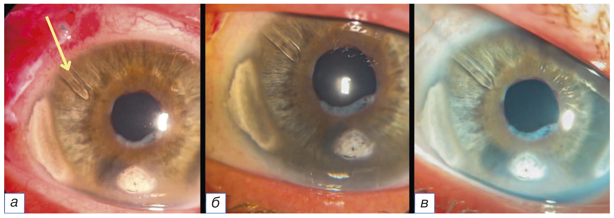 Рис. 5. Биомикроскопия правого глаза после имплантации клапана Ахмеда: а — первые сутки (стрелкой указана трубка клапана); б — через 6 месяцев; в — через 15 месяцев