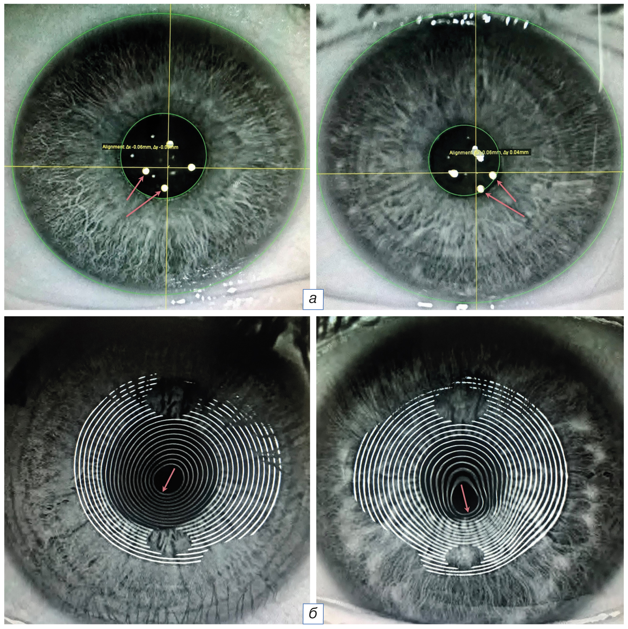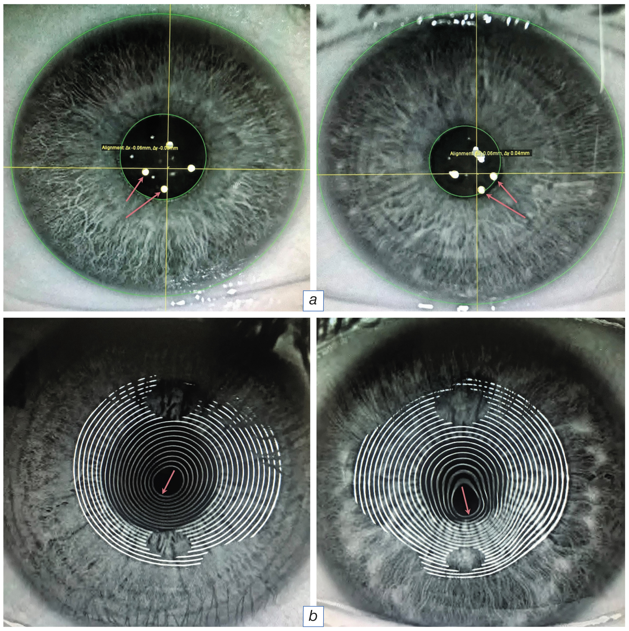 Fig. 1. Cornea anterior surface reflexes in keratoconus: a — autorefractokeratometry four dot marks displacement (red arrows indicate spot light reflexes shift adjacent to ectasia apex); b — Placido disk mires-rings distortion (red arrows indicate concentric light reflexes convergence adjacent to ectasia apex).