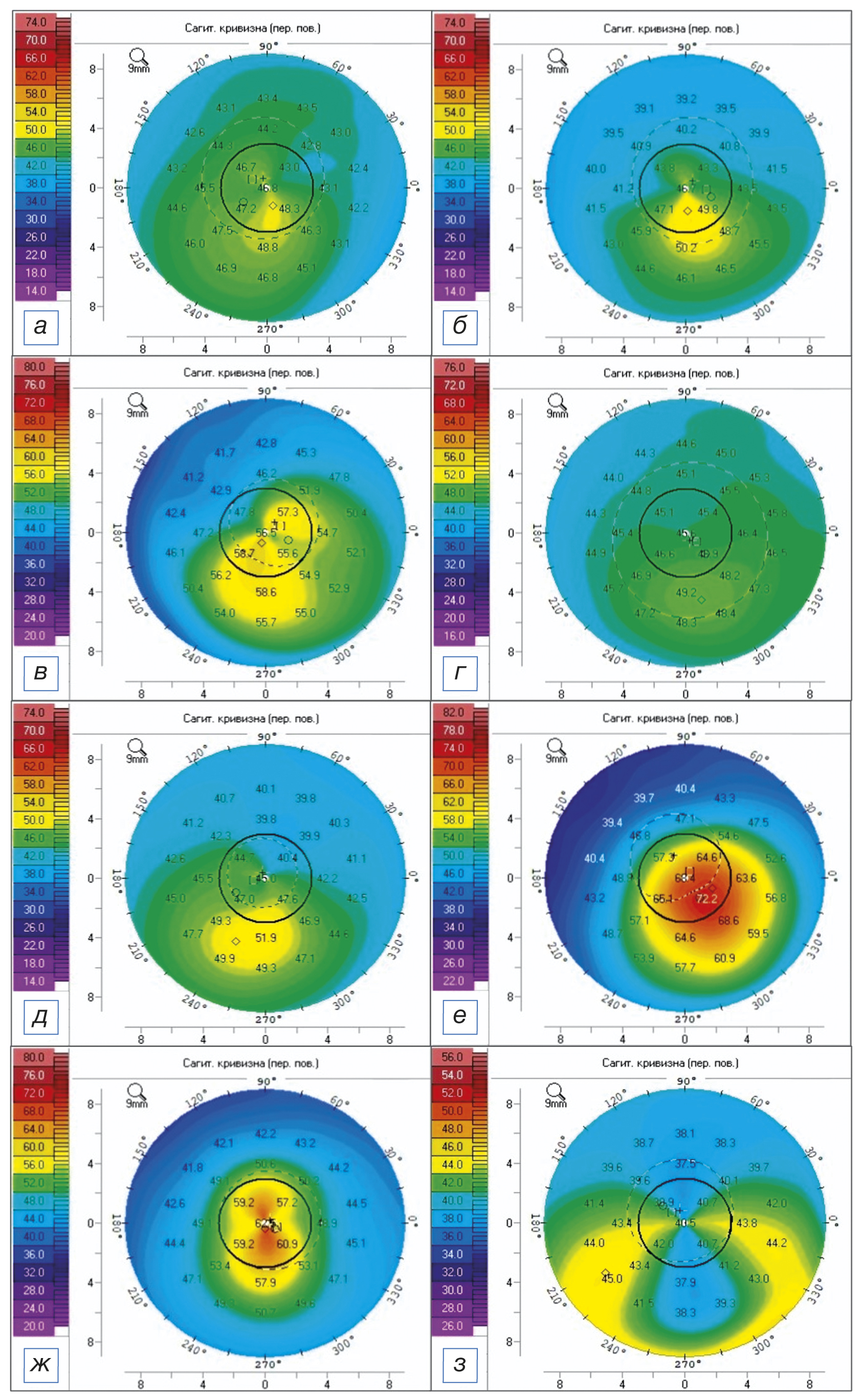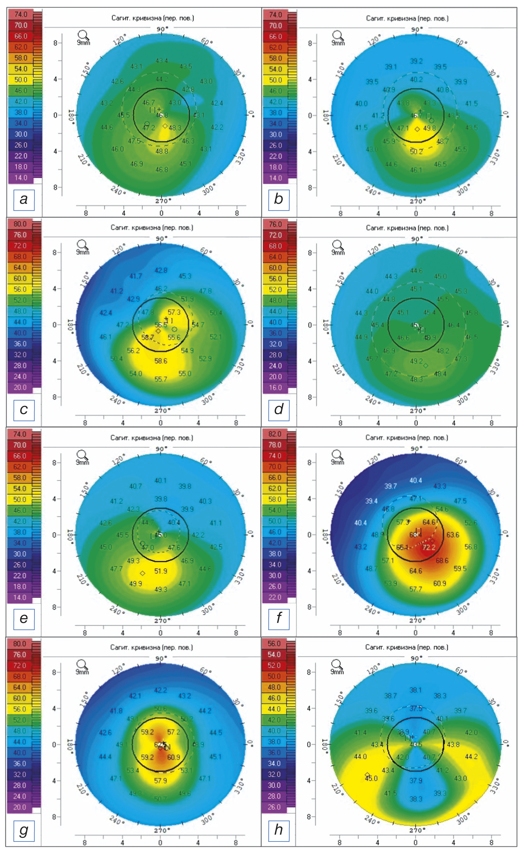 Fig. 4. Cornea anterior surface keratometry maps in keratoconus. The numerical values of the cornea refractive power (diopters) at each point of the map are indicated. Typical keratoconus patterns: а, b — asymmetric «bow-tie» with inferior steepening; c — «bow-tie» with screwed axes; d–f — local inferior steepening; g — «baby bow-tie»; h — «crab claw», or «kissing birds».