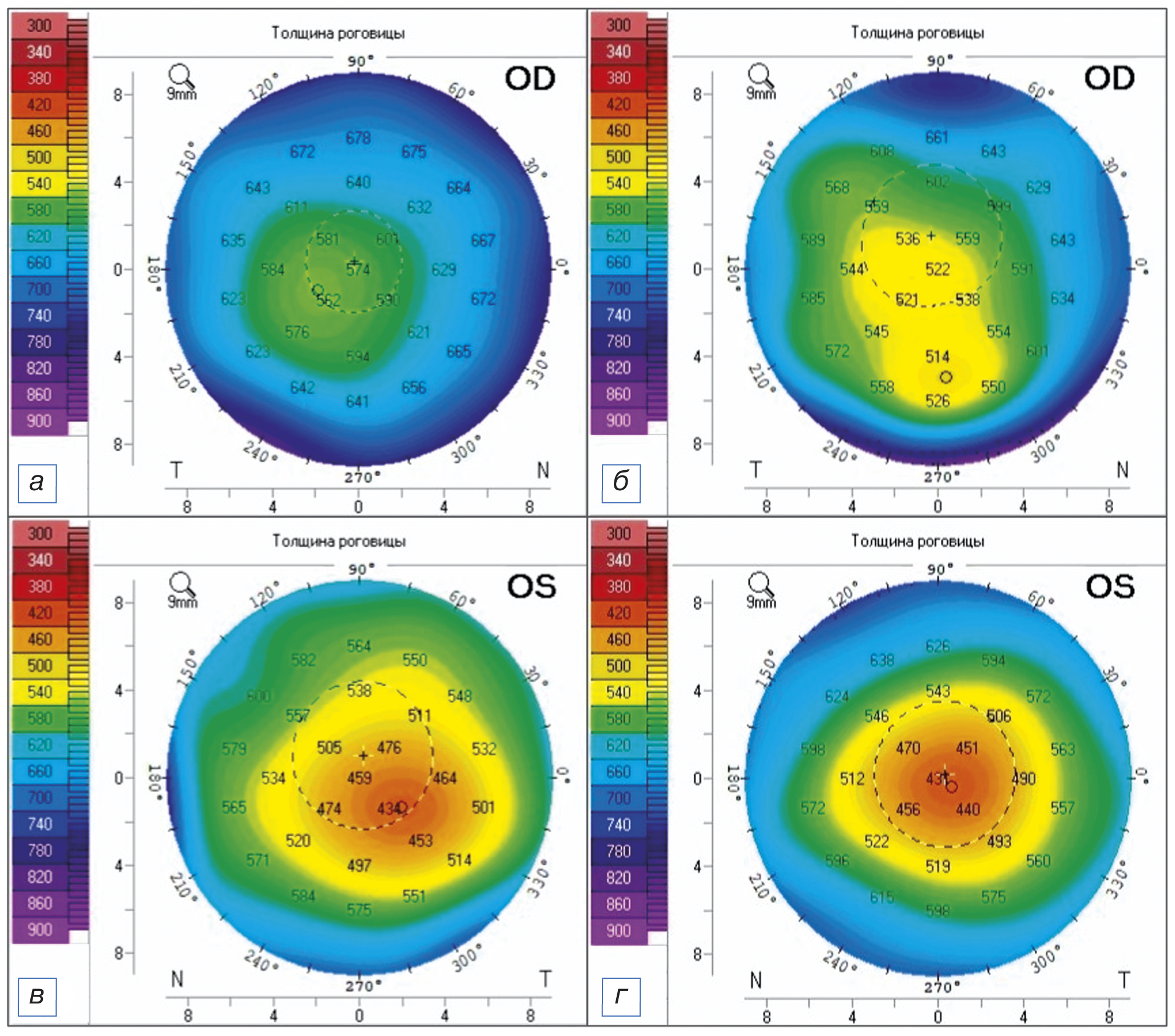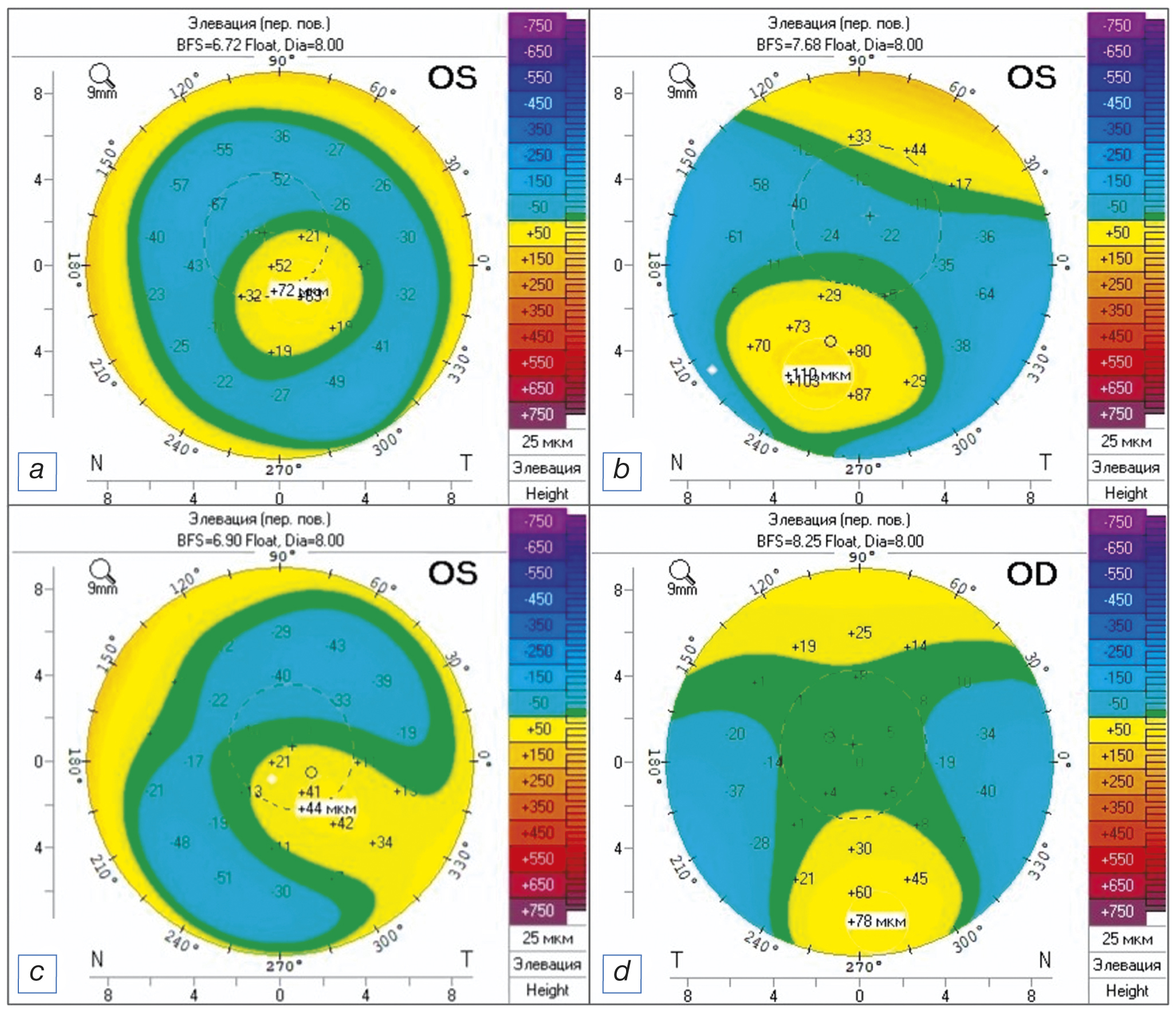 Fig. 5. Cornea pachymetry maps in keratoconus: а–c — inferiorly displaced thinnest point; c, d — significant decrease in minimal cornea thickness.
