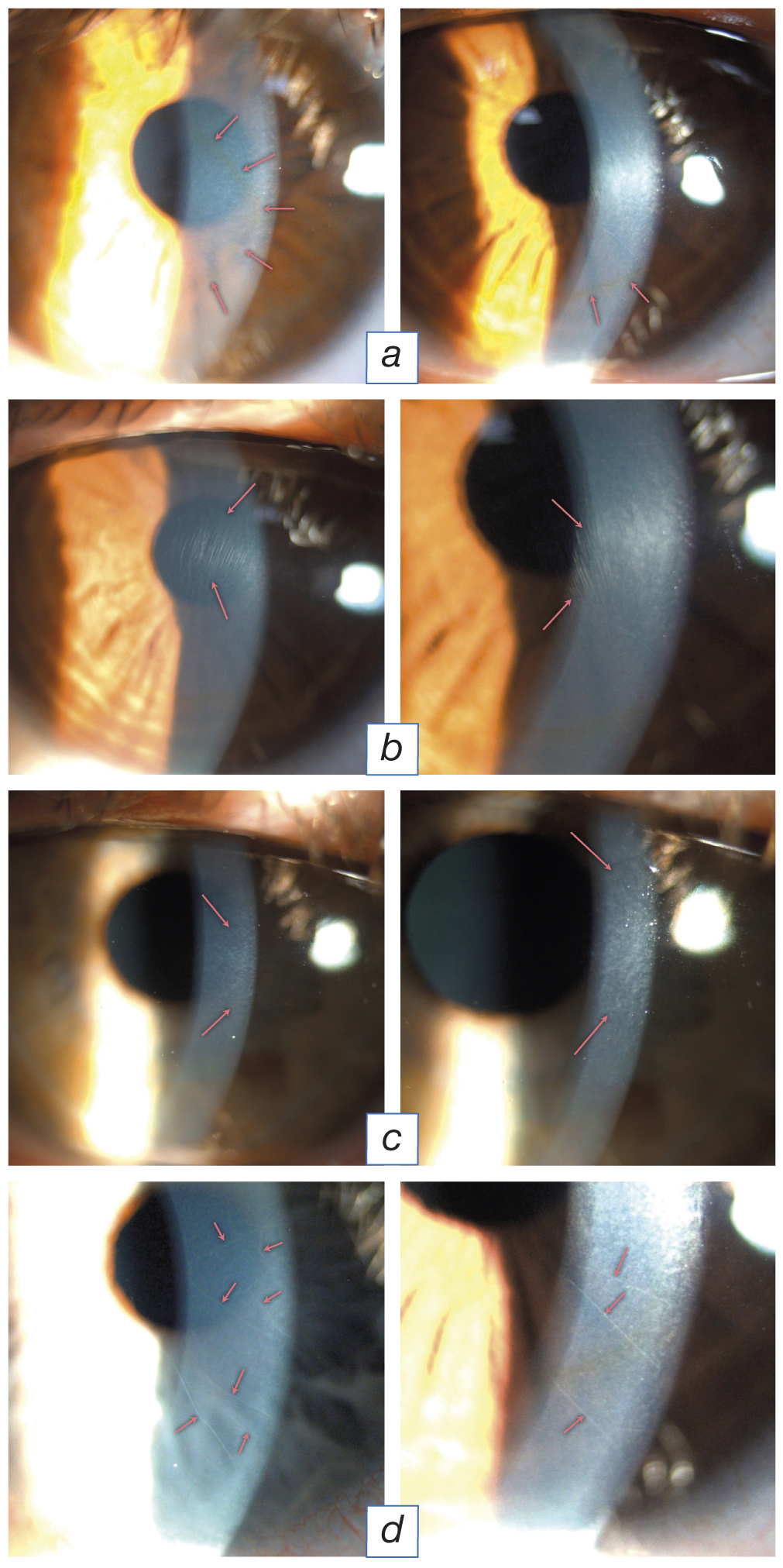 Fig. 2. Slit-lamp imaging of keratoconic cornea (red arrows point keratoconus signs): a — Fleischer ring; b — Vogt’s striae; c — fading star or firework symptom; d — stromal nerves.