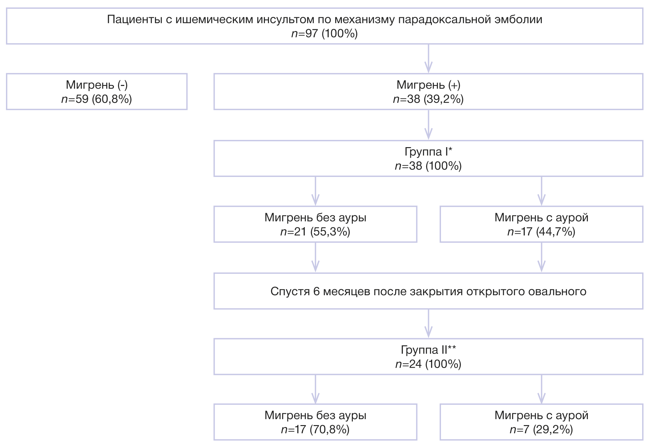 Критерии включения: в группу I — пациенты, перенёсшие ишемический инсульт по механизму парадоксальной эмболии; в группу II — пациенты, перенёсшие ишемический инсульт по механизму парадоксальной эмболии, прошедшие процедуру закрытия открытого овального окна, с мигренью в анамнезе.