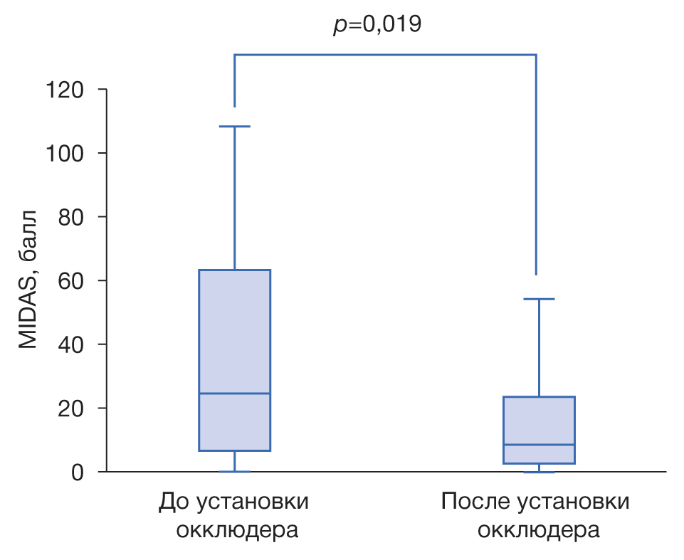 По результатам анализа зависимых выборок (до и после установки окклюдера) выявлено достоверное снижение частоты приступов мигрени с 4 [2; 24] до 2 [1; 5] дней в месяц (р=0,009); сокращение интенсивности головной боли с 7 [7; 9] до 3 [3; 7] баллов по ВАШ (р=0,0001) (рис. 2). Статистически значимо уменьшилась степень влияния мигрени на повседневную активность пациентов c 20 [6; 89] до 17 [2; 26] баллов (р=0,019), согласно опроснику MIDAS (рис. 3).
