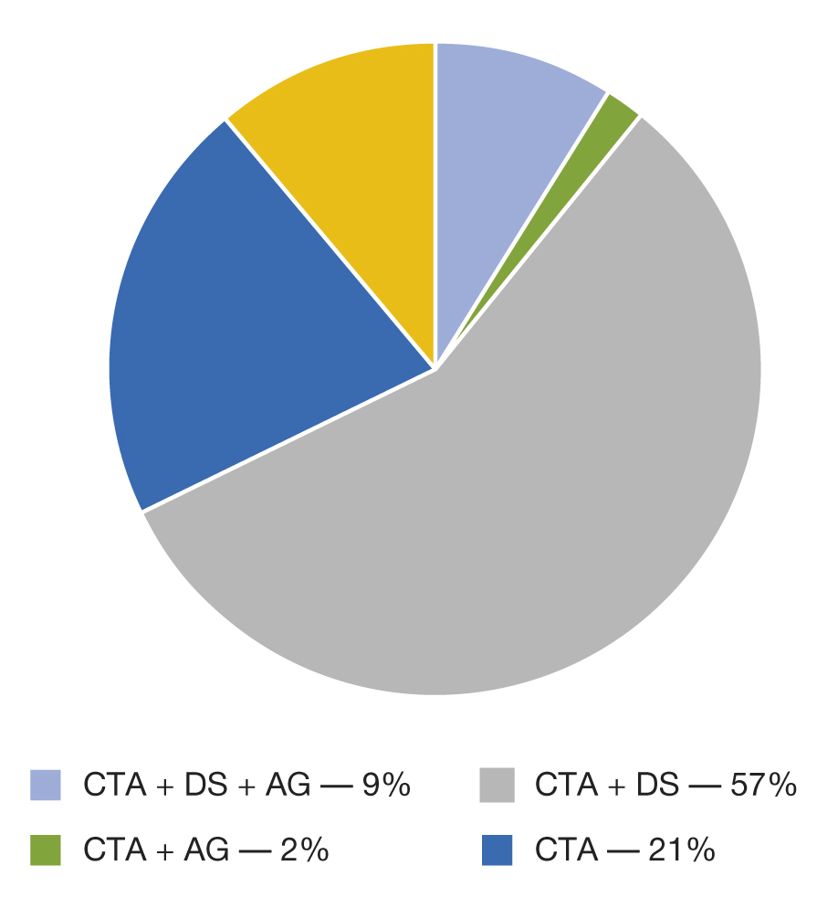 All the 207 patients were undergoing diagnostic examinations: CTA — 189, DS — 164, AG — 21, with 16 patients having all the mentioned types of examinations (all of them being operated). Before the conduction of AG, CTA was always carried out. The combined diagnostics by means of CTA and DS was reported for 146 patients.