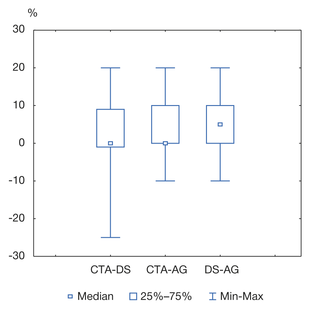 The comparative analysis also included the data on the differences observed when assessing the percentage of stenosis in the orifices of the internal carotid arteries when using two of the three methods (if any). The main analysis of discrepancies was carried out in groups: the percentage of stenosis according to CTA data minus the percentage of stenosis according to DS data (CTA-DS) and the percentage of stenosis according to DS data minus the percentage of stenosis according to AG data (DS-AG).