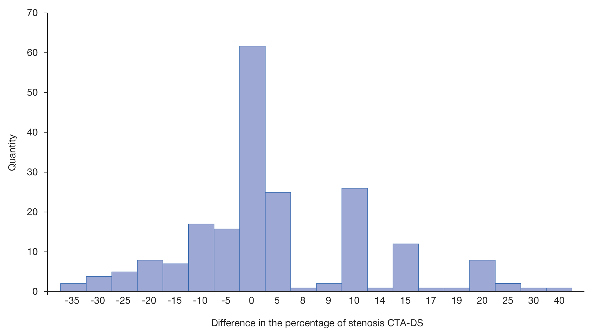 A total of 130 patients from the group 2 — 202/260 (77.7%) ICA — had atherosclerotic plaques. The distribution of differences in evaluating the stenoses between CTA and DS is shown in Fig. 3. In 149/202 (73.8%) ICA, there were no deviations or they were within the range of 10%, in 23/202 (11.4%) — from 15 to 20%, in 15/202 (7.4%) — ≥20%, with the predominance of higher stenosis degree in the results of the DS — 26 (12.9%) cases, while lower percentage of stenosis was found in 12 (5.9%) cases.
