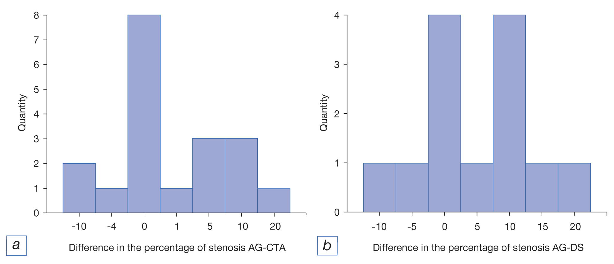 Fig. 4. The histogram of the distribution of differences in evaluating the stenoses in the orifices of the internal carotid arteries: а — AG data minus CTA data; b — AG data minus DS data. CTA — computed tomographic angiography; DS — duplex scanning of the brachiocephalic arteries; AG — transcatheter X-ray contrast angiography. [From the archive of the Federal State Budgetary Institution «Federal Scientific and Clinical Center» under the Russian Federal Medical-Biological Agency, 2025. Published for the first time].