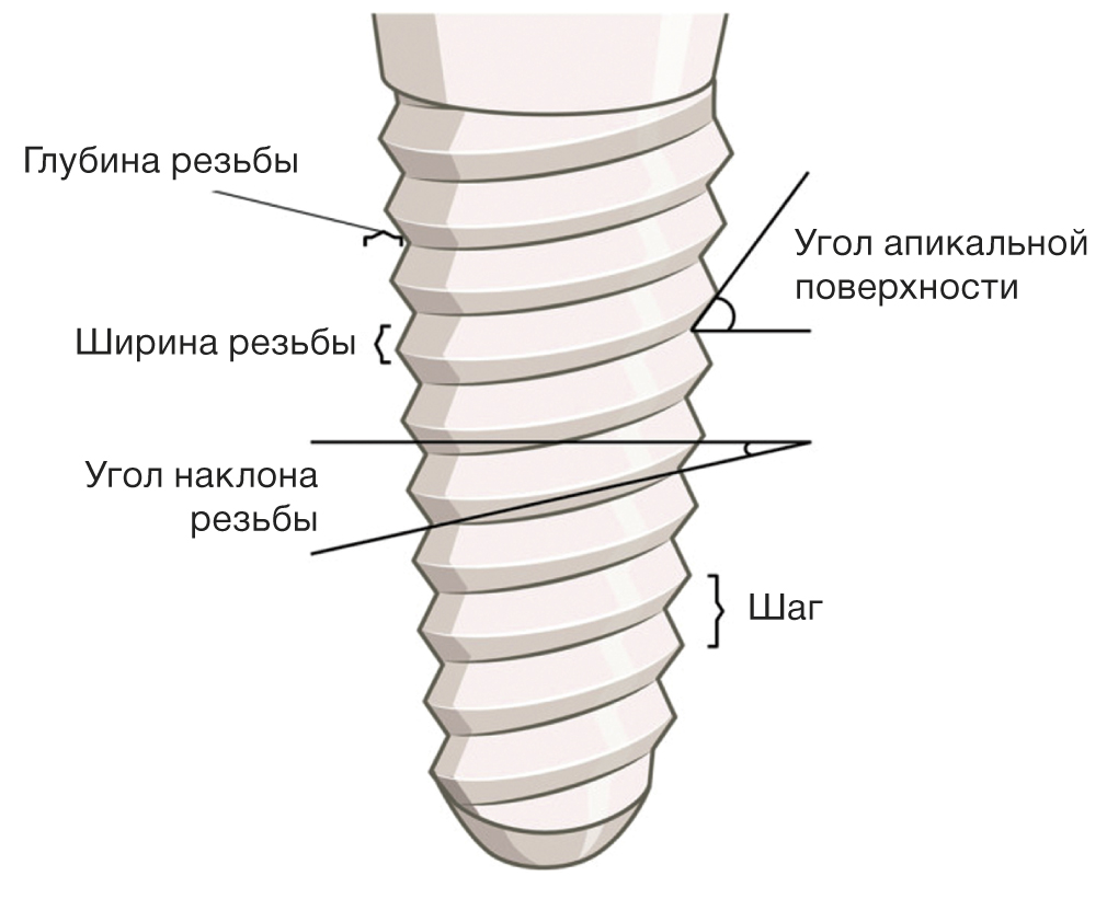 The thread slope angle defines the movement of the implant upon its installation: the bigger is the slope, the lesser number of turns is required for the implant to be installed at its whole length. However, larger slope angle of the thread helix can result in longitudinal rotation of the implant under axial load. The slope angle directly depends on the thread shape: thus, the V-shaped thread is characterized by an optimal frontal angle of 30о, while the reverse counter-force thread has an angle of 15о. К.Sadr et al. [39] have defined that the most favorable for successful osteointegration are the implants with areverse thread with angles of 20о and 30о, as well as with the trapezoid thread with an angle of 35о.