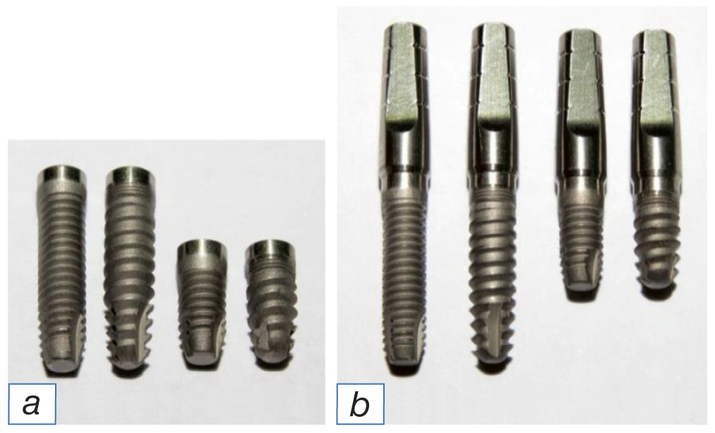 Fig. 2. Implant Length (l): а — standard (13 mm) and short (7 mm) cylindrical and conical implants (4 mm diameter); b — implants with abutments. The images are distributed under to the terms of the Creative Commons Attribution 4.0 license (CC-BY 4.0) [27].