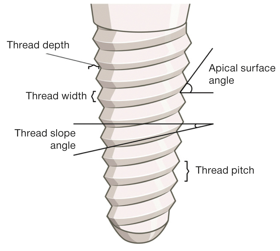 The following characteristics can be described in terms of the implant macro-construction: thread pitch; width and depth of thread; thread slope angle; apical surface angle (Fig. 3) [25].