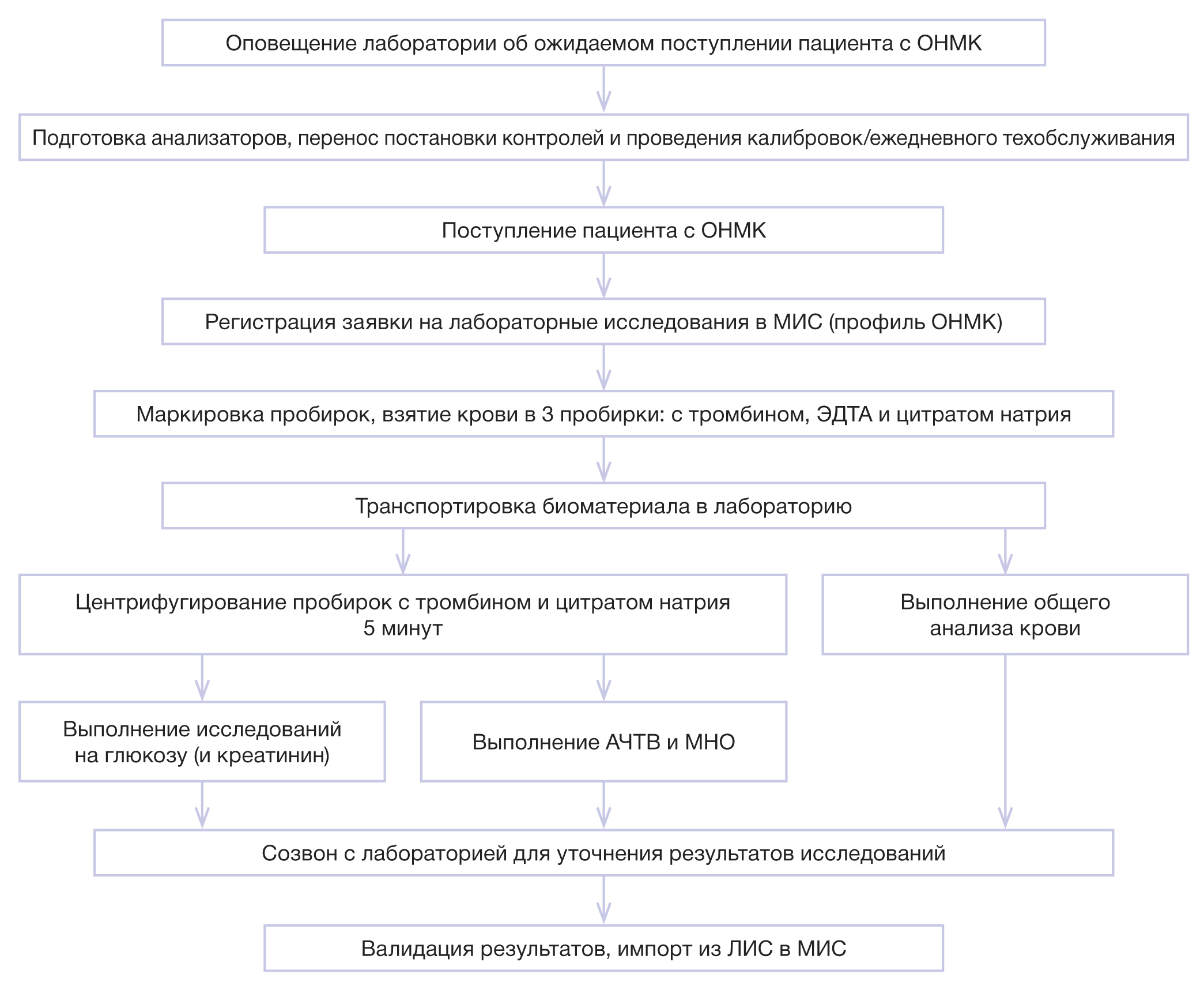 Upon planning the opening of the Department for patients with acute cerebral circulation disorders, the laboratory of the Federal State Budgetary Institution “Federal Center of Brain Research and Neurotechnologies” under the Federal Medical- Biological Agency (FSBI FCBRN of the RFMBA) has received a task of organizing the procedures of conducting emergency laboratory tests for the presenting patients in accordance with the current regulatory documents — within 20 minutes from the hospitalization moment. This time interval includes the time required for assessing the patient, for issuing the referrals for testing, for drawing the blood sample, for the transportation of test tubes to the laboratory, the centrifugation, the testing procedures and the issuance of the result.