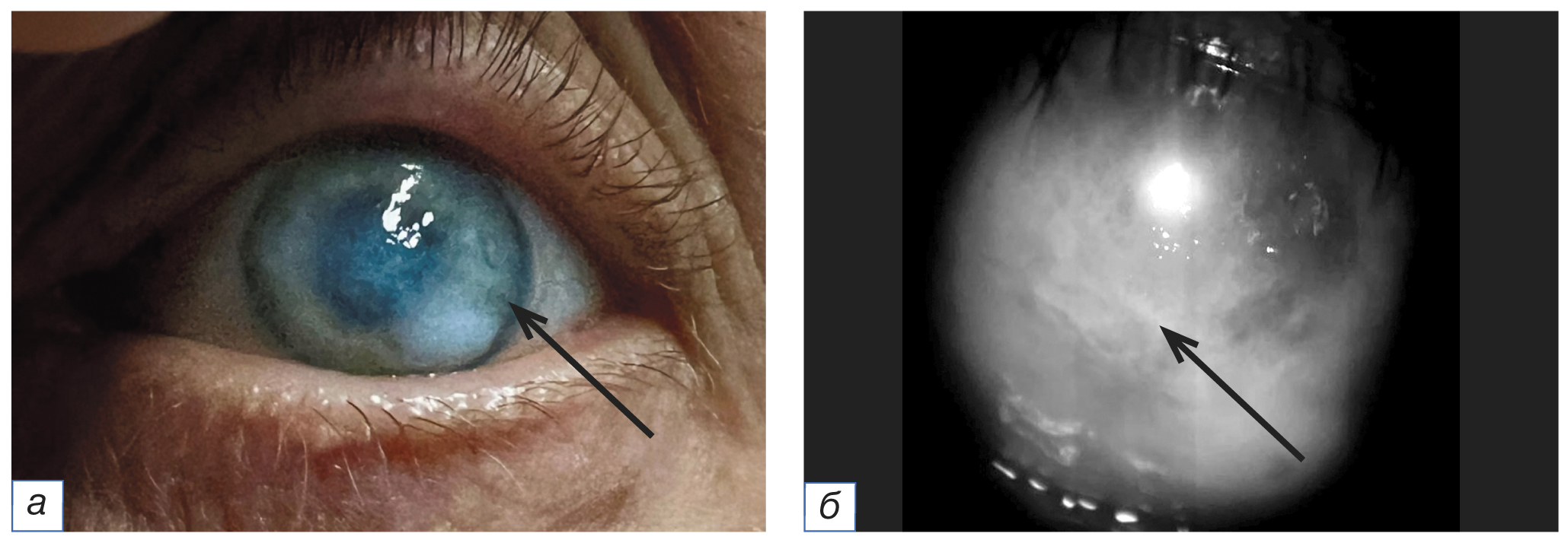Fig. 1. Status of the eye after laser cyclophotocoagulation (before the conduction of the penetrating keratoplasty): а — appearance ×3; b — appearance ×16. The arrow indicates the swelling of the cornea with cloudiness in the stroma).