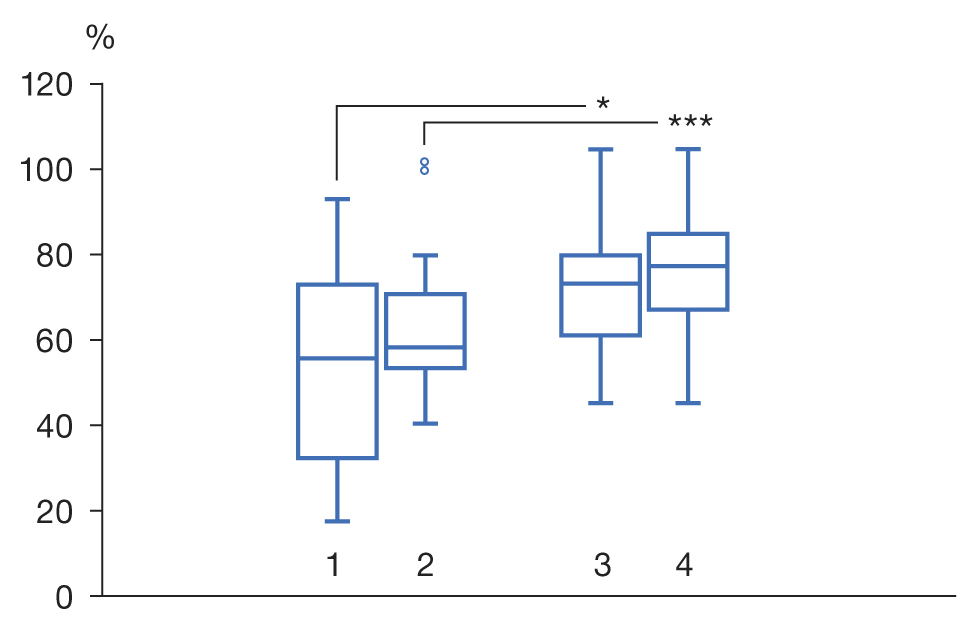 Fig.1. Loss of excess body weight in 12 months after bariatric surgery: 1 — laparoscopic longitudinal gastric resection (older age group), 2 — laparoscopic gastric bypass surgery (older age group), 3 — laparoscopic longitudinal gastric resection (main group), 4 — laparoscopic gastric bypass surgery (main group). The differences were statistically significant: p<0.05 (*) and p <0.001 (***).