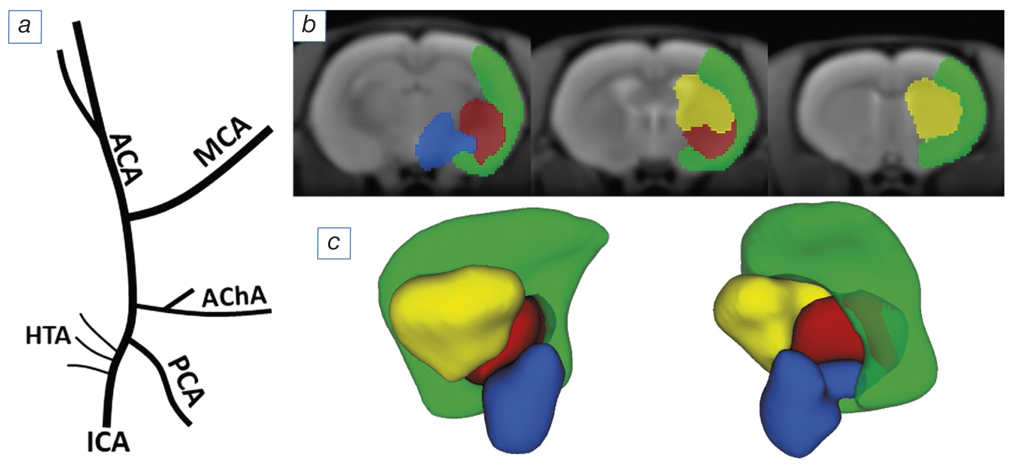 Fig. 3. The pattern of origination of the intracranial branches of the internal carotid artery and the compiled atlas of their blood supply zones: а — the chart showing the origination of the intracranial branches of the internal carotid artery (compiled based on the data obtained by Z. He et al. [7]); b — sequential slices in the axial plane with the location of blood supply zones in them (green color marks the zone of the cortical branches of the medial cerebral artery, yellow — the zone of the medial cerebral artery, supplying the subcortical area, red — the zone of anterior choroid artery, blue — the zone of hypothalamic arteries); c — three-dimensional reconstruction of the atlas of blood supply zones for the intracranial branches of the internal carotid artery (color marking identical to point “b”). ICA — internal carotid artery; PCA — posterior cerebral artery; MCA — median cerebral artery; AChA — anterior choroid artery; HTA — hypothalamic arteries.